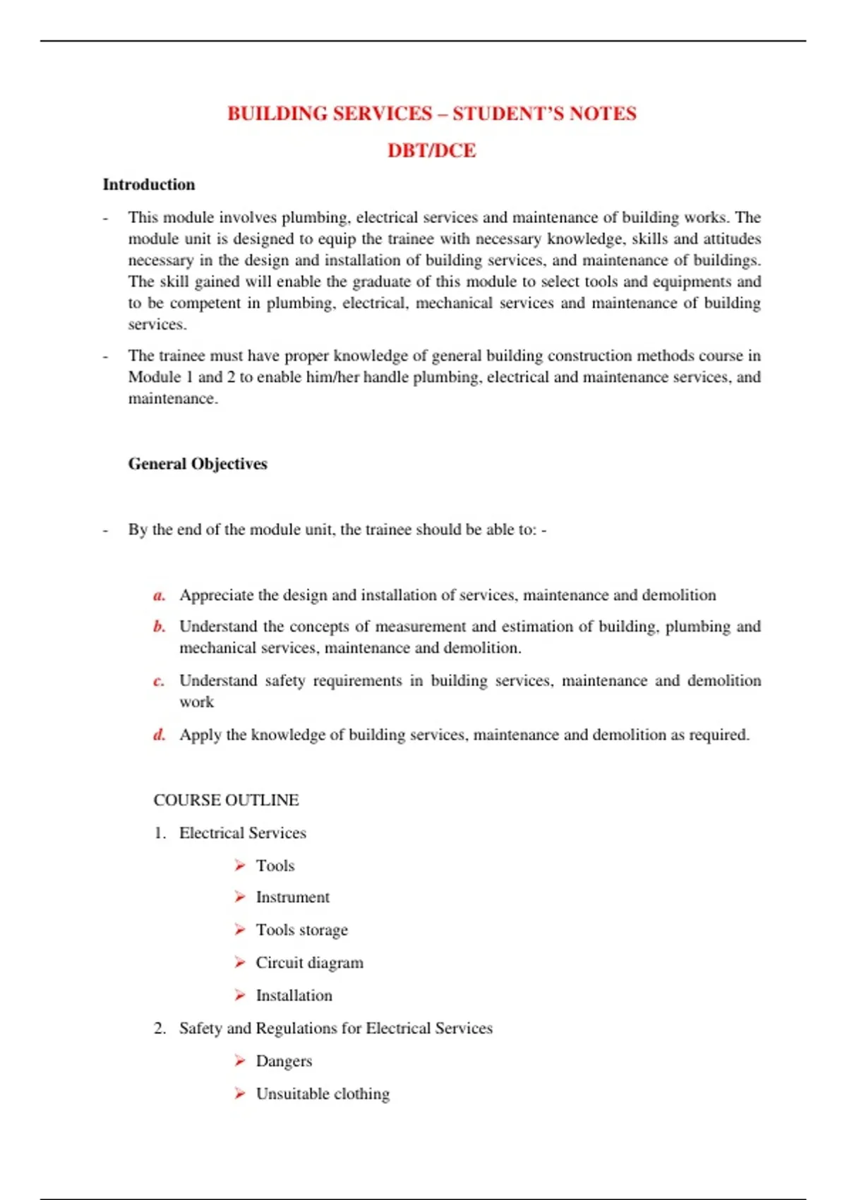 - This module involves plumbing, electrical services and maintenance of building works. The