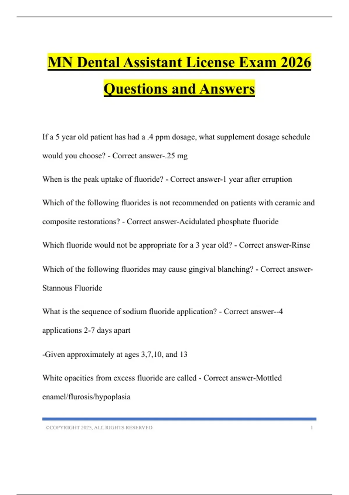 MN Dental Assistant License Exam 2026 Questions and Answers