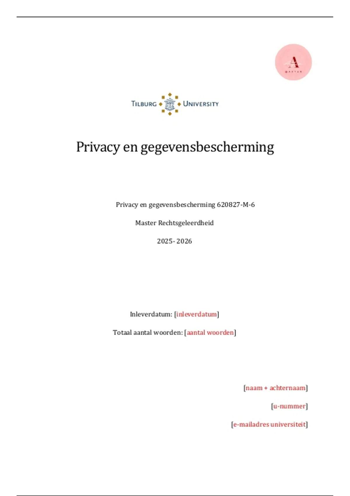 Master Rechtsgeleerdheid (Tilburg University) - Privacy en Gegevensbescherming jurdische memo