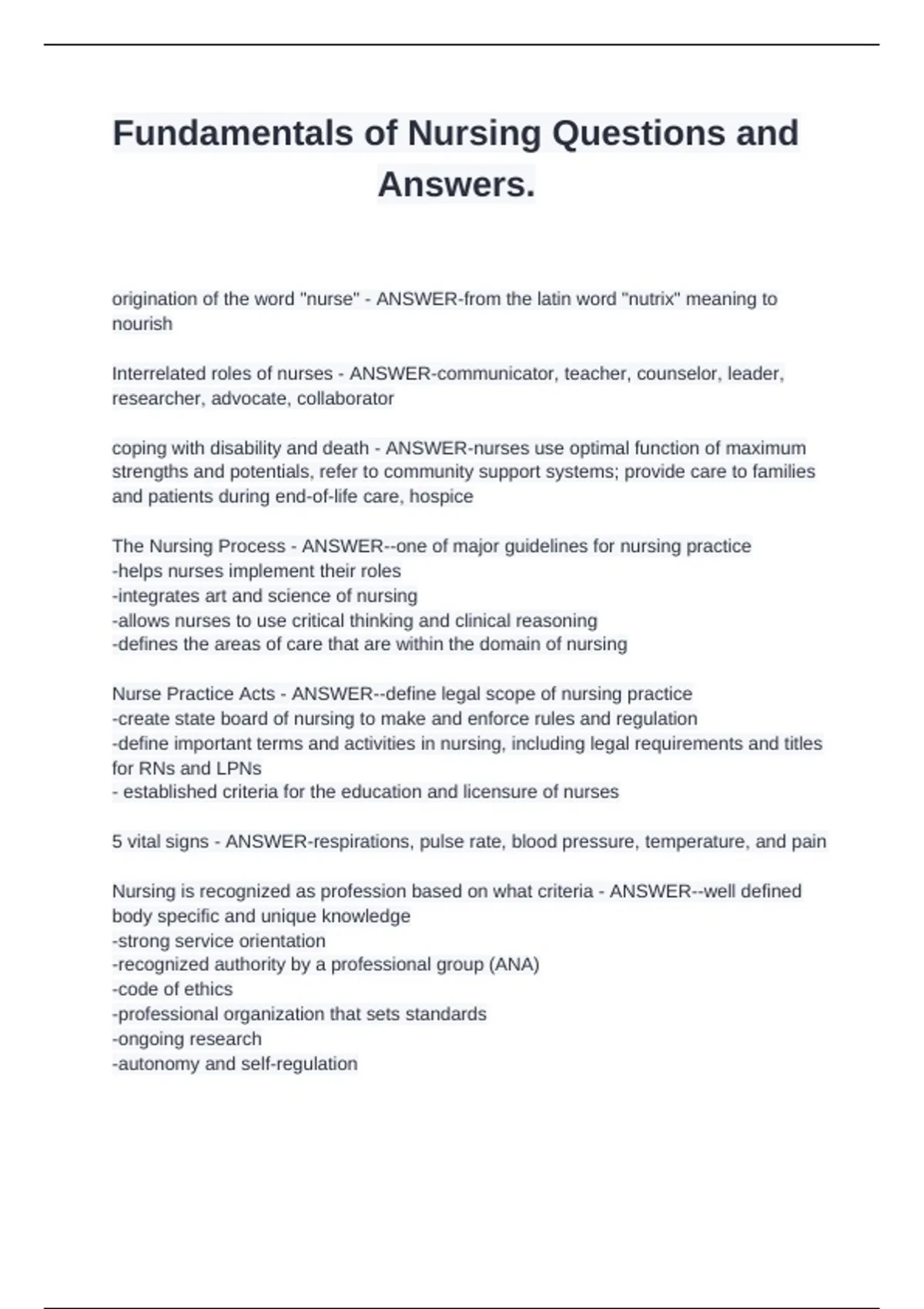 Fundamentals of Nursing Questions and answers