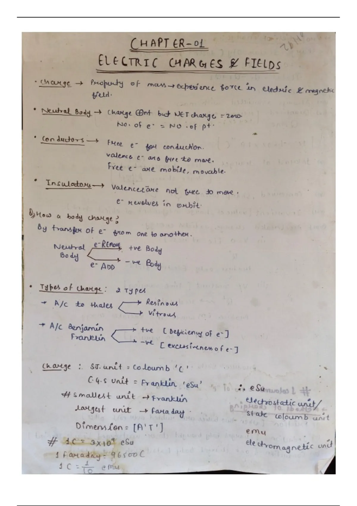 Short notes for class 12 physics chapter 1 electric field and charges for NEET as well as board students