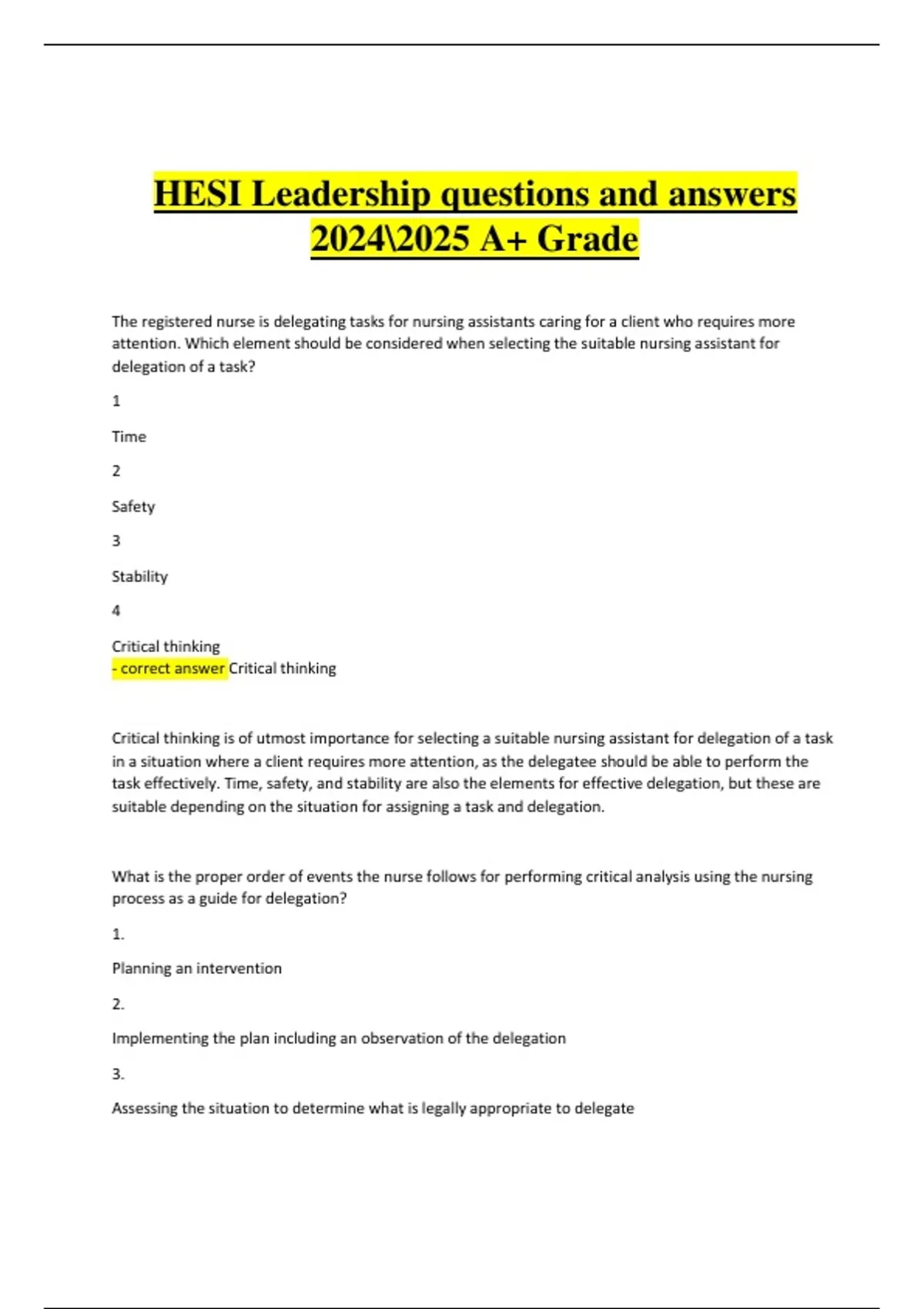 The HESI Leadership Exam (2024/2025 Edition) is a verified, A+ graded study guide with the latest exam questions and correct answers. It prepares nursing students for the Leadership & Management portion of the HESI Exit Exam, focusing on delegation, prioritization, communication, and ethical/legal responsibilities.The HESI Leadership & Management Exam is part of the HESI RN Exit Exam, designed to evaluate a nurse’s ability to lead teams, manage patient care, and apply critical thinking in complex healthcare environments. Key Learning Objectives: Apply leadership styles (transformational, transactional, servant leadership). Demonstrate delegation and prioritization skills. Use therapeutic communication and conflict resolution strategies. Understand ethical and legal responsibilities in nursing practice. Manage staffing, scheduling, and resource allocation. Apply quality improvement and patient safety principles.