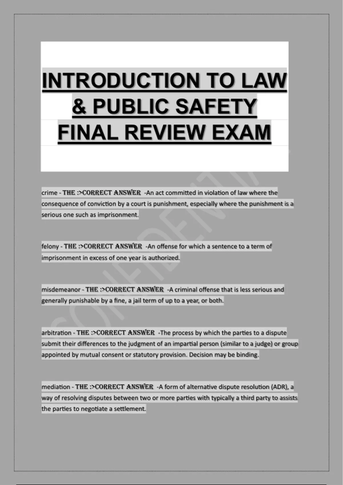 INTRODUCTION TO LAW & PUBLIC SAFETY FINAL REVIEW EXAM crime - THE :>CORRECT ANSWER -An act committed in violation of law where the consequence of conviction by a court is punishment, especially where the punishment is a serious one such as imprisonment. felony - THE :>CORRECT ANSWER -An offense for which a sentence to a term of imprisonment in excess of one year is authorized. misdemeanor - THE :>CORRECT ANSWER -A criminal offense that is less serious and generally punishable by a fine, a jail term of up to a year, or both. arbitration - THE :>CORRECT ANSWER -The process by which the parties to a dispute submit their differences to the judgment of an impartial person (similar to a judge) or group appointed by mutual consent or statutory provision. Decision may be binding. mediation - THE :>CORRECT ANSWER -A form of alternative dispute resolution (ADR), a way of resolving disputes between two or more parties with typically a third party to assists the parties to negotiate a settlement.