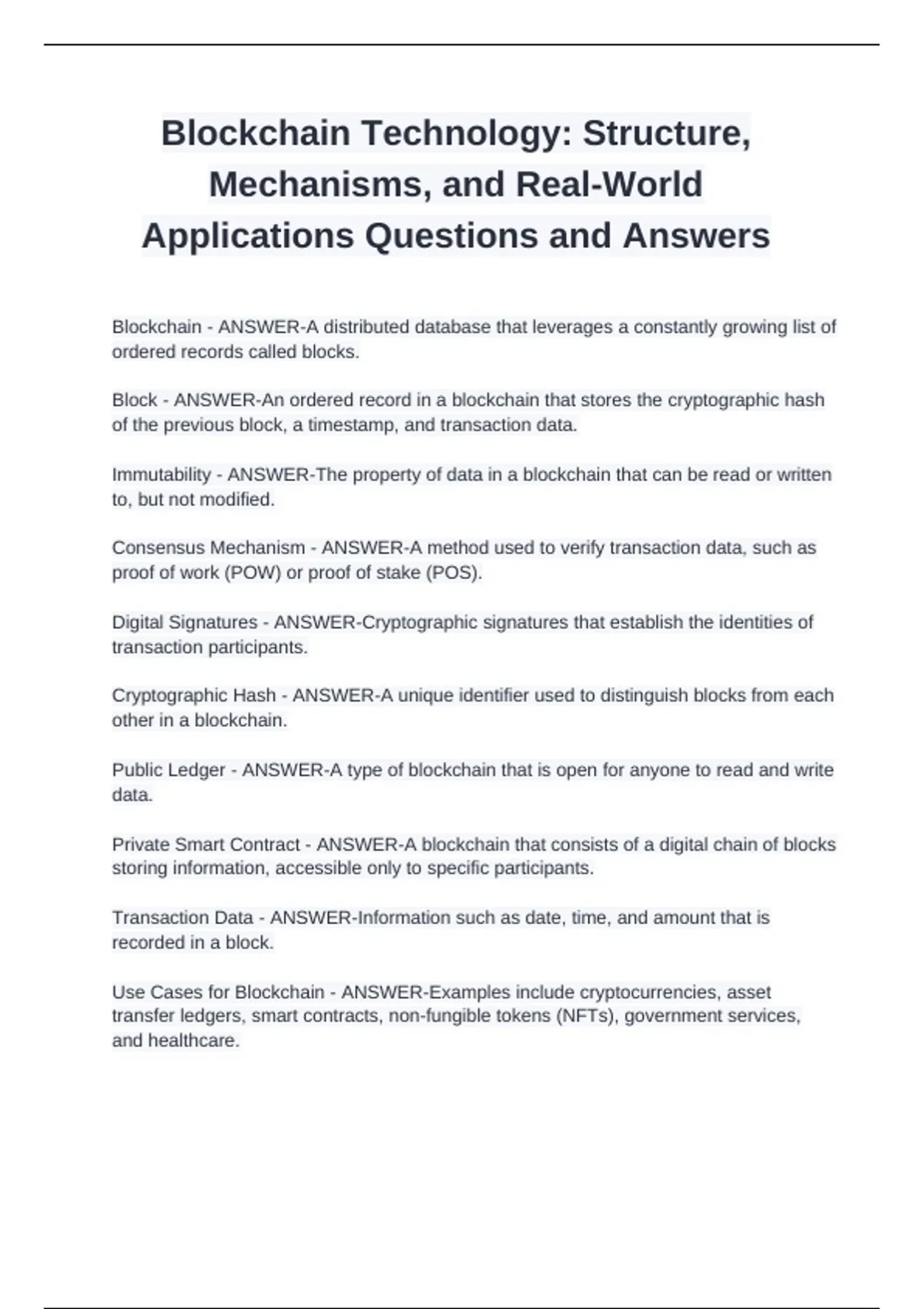 Consensus Mechanism - ANSWER-A method used to verify transaction data, such as