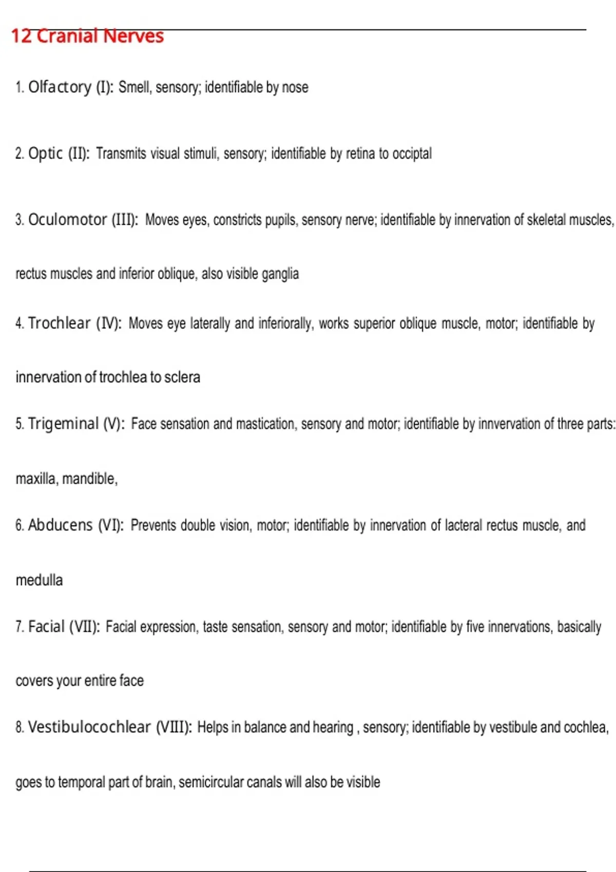 8. Vestibulocochlear (VIII): Helps in balance and hearing , sensory; identifiable by vestibule and cochlea,
