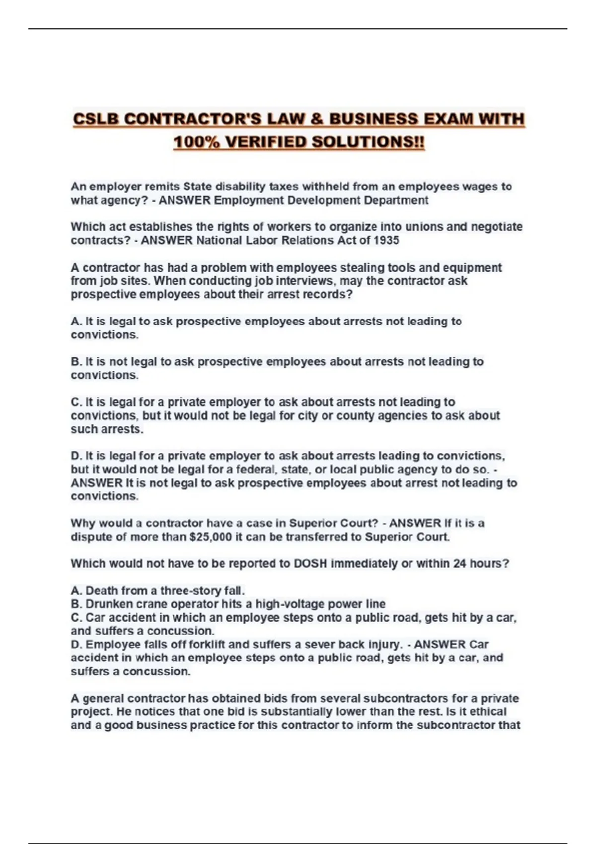 CSLB CONTRACTOR'S LAW & BUSINESS EXAM WITH 100% VERIFIED SOLUTIONS!!...
