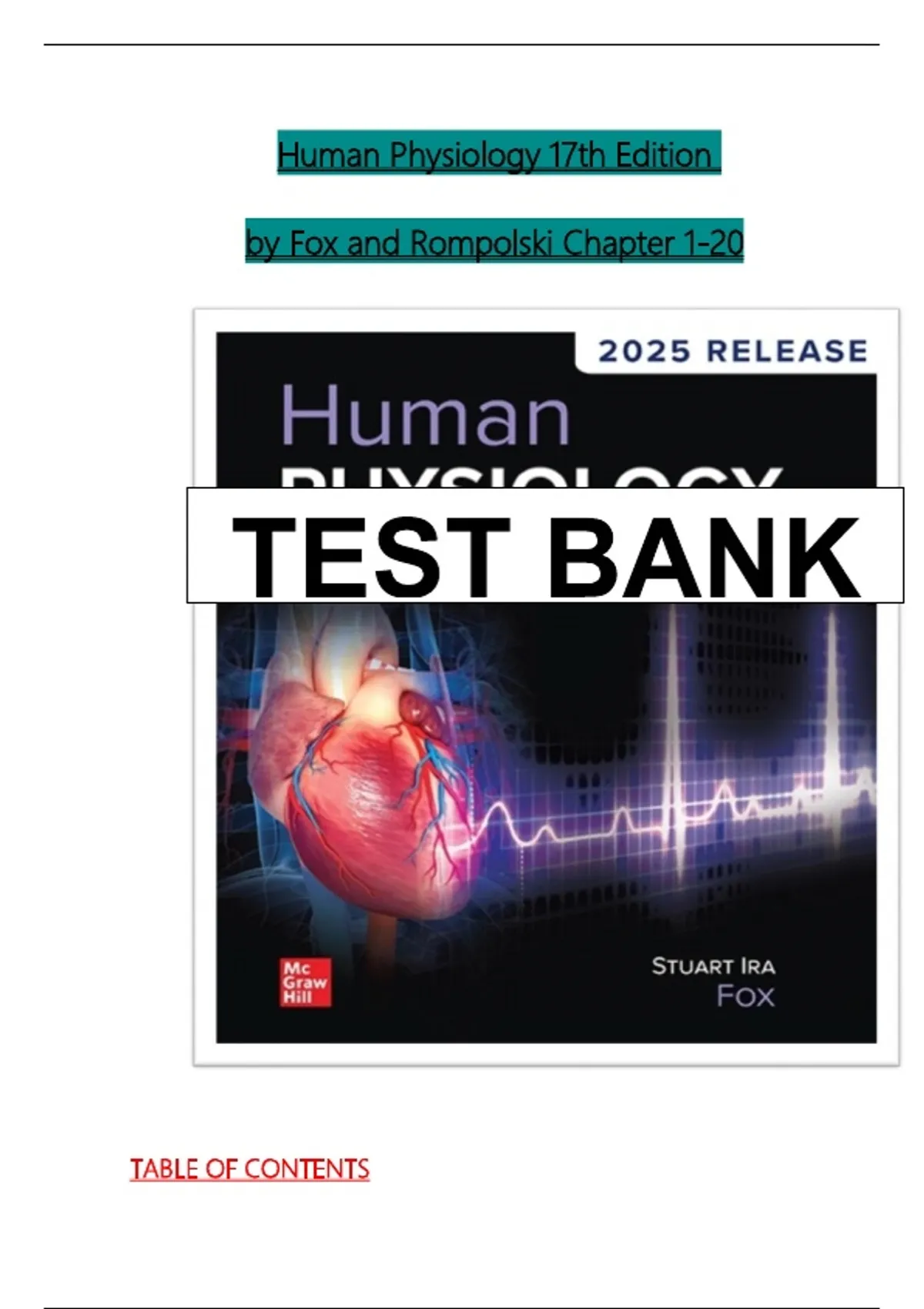 Title: Human Physiology – Fox & Rompolski 17th Edition – Complete Test Bank (Chapters 1–20) with Answers Description: This document contains the complete test bank for Human Physiology by Fox & Rompolski, 17th edition, covering all 20 chapters of the textbook. It includes hundreds of multiple-choice and true/false questions with answer keys provided at the end of each chapter. Topics range from cell biology, nervous and endocrine systems, cardiovascular physiology, to metabolism and reproduction. Perfect for exam preparation, self-assessment, or test creation aligned with the official textbook content. Keywords: test bank human physiology chapter quizzes multiple choice questions true false questions exam preparation answers included fox and rompolski 17th edition college physiology