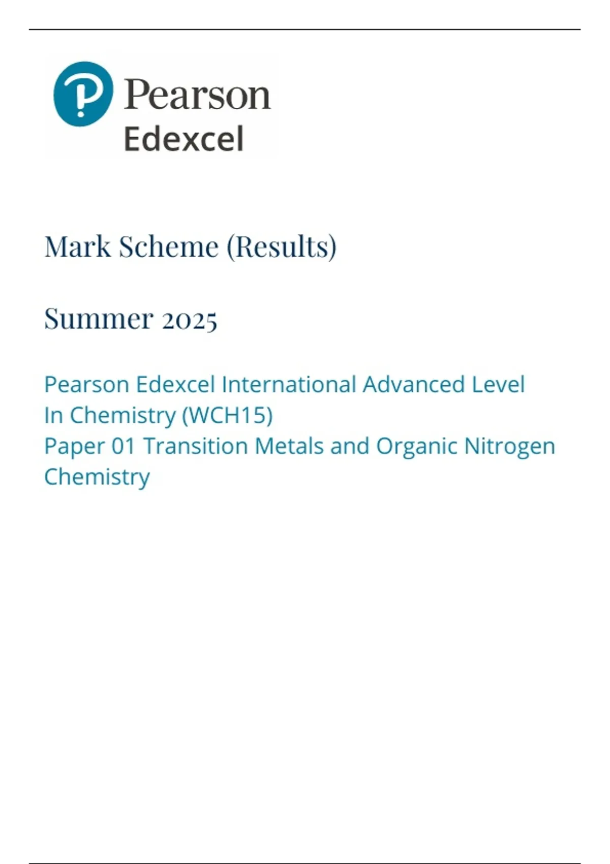 Pearson Edexcel International Advanced Level Chemistry UNIT 5 JUNE 2025 MARK SCHEME: Transition Metals and Organic Nitrogen Chemistry