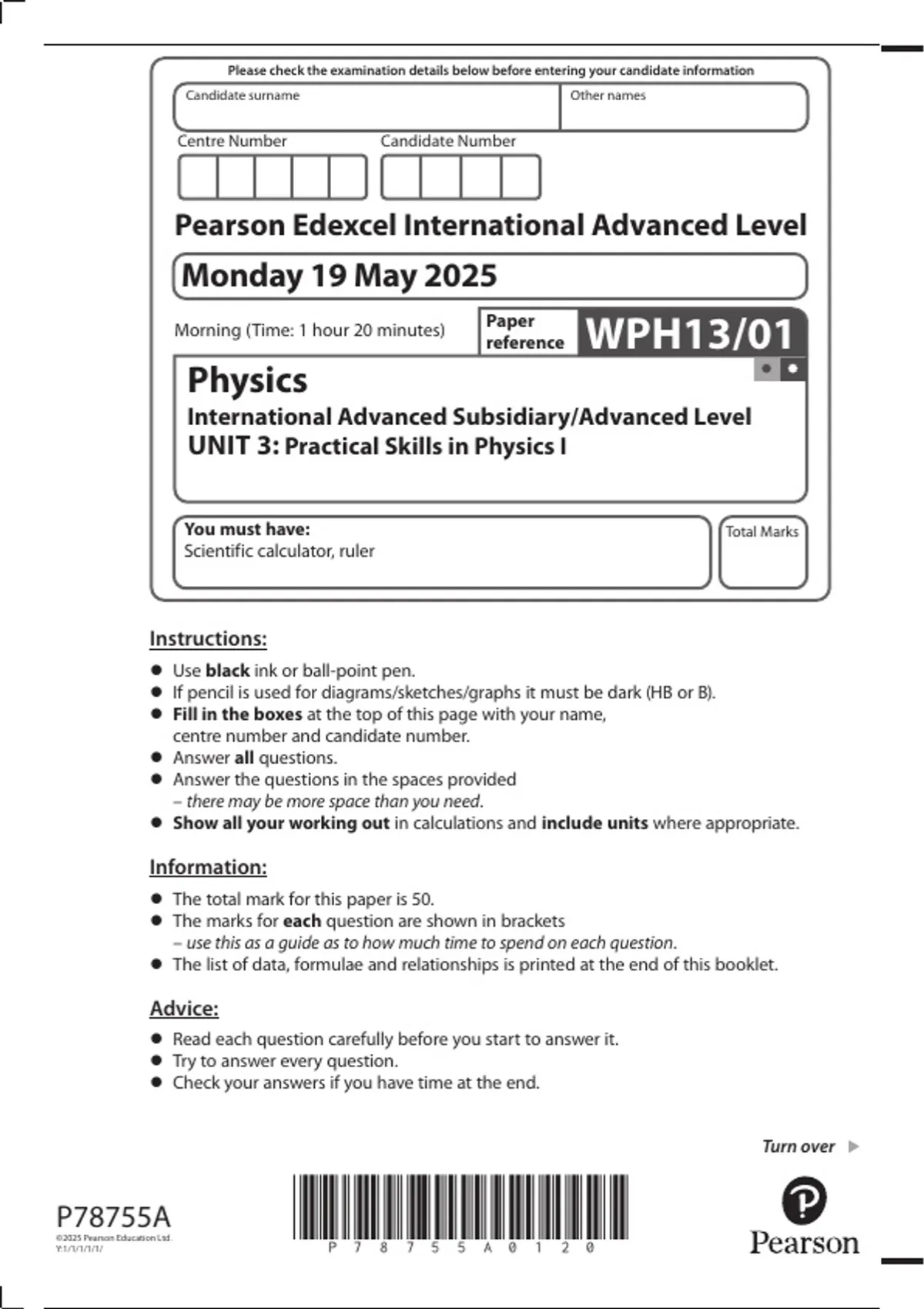Pearson Edexcel International Advanced Level Physics UNIT 3 MAY 2025 QUESTION PAPER: Practical Skills in Physics I
