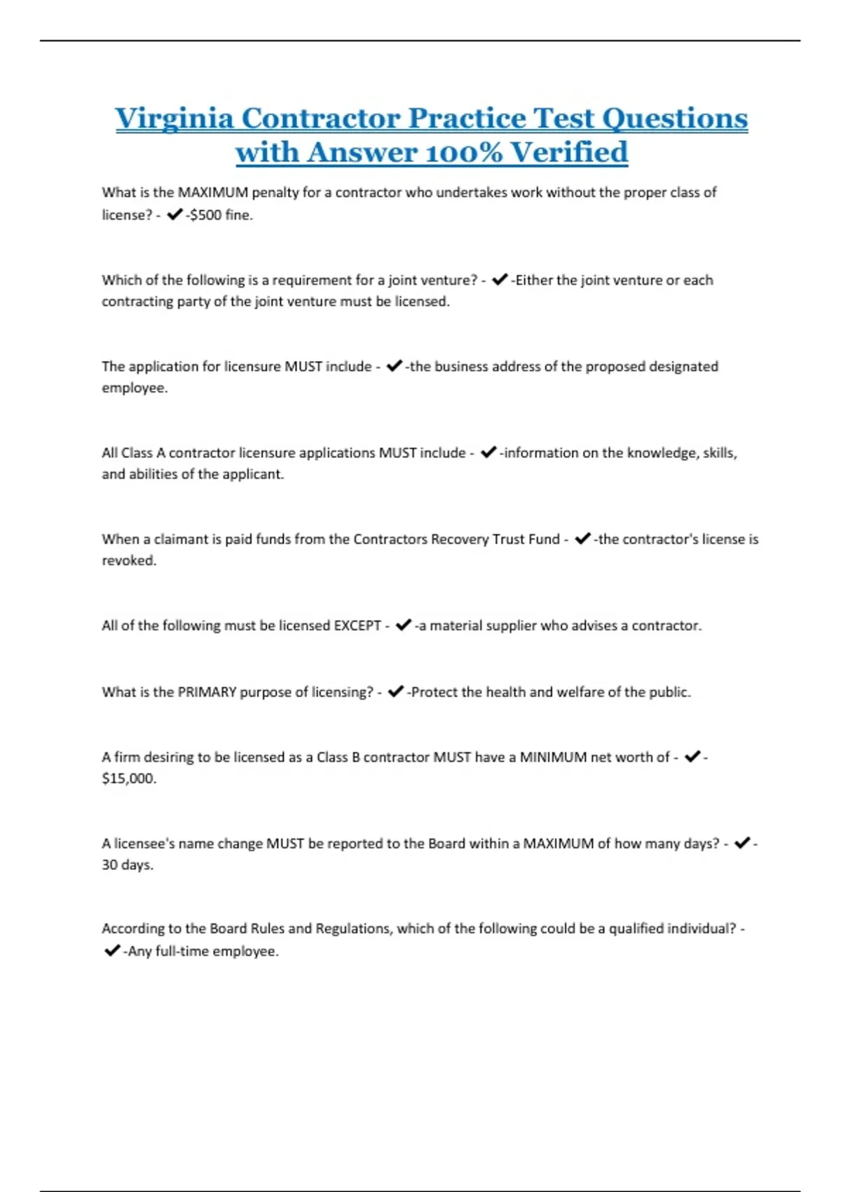 Virginia Contractor Practice Test Questions with Answer 100% Verified