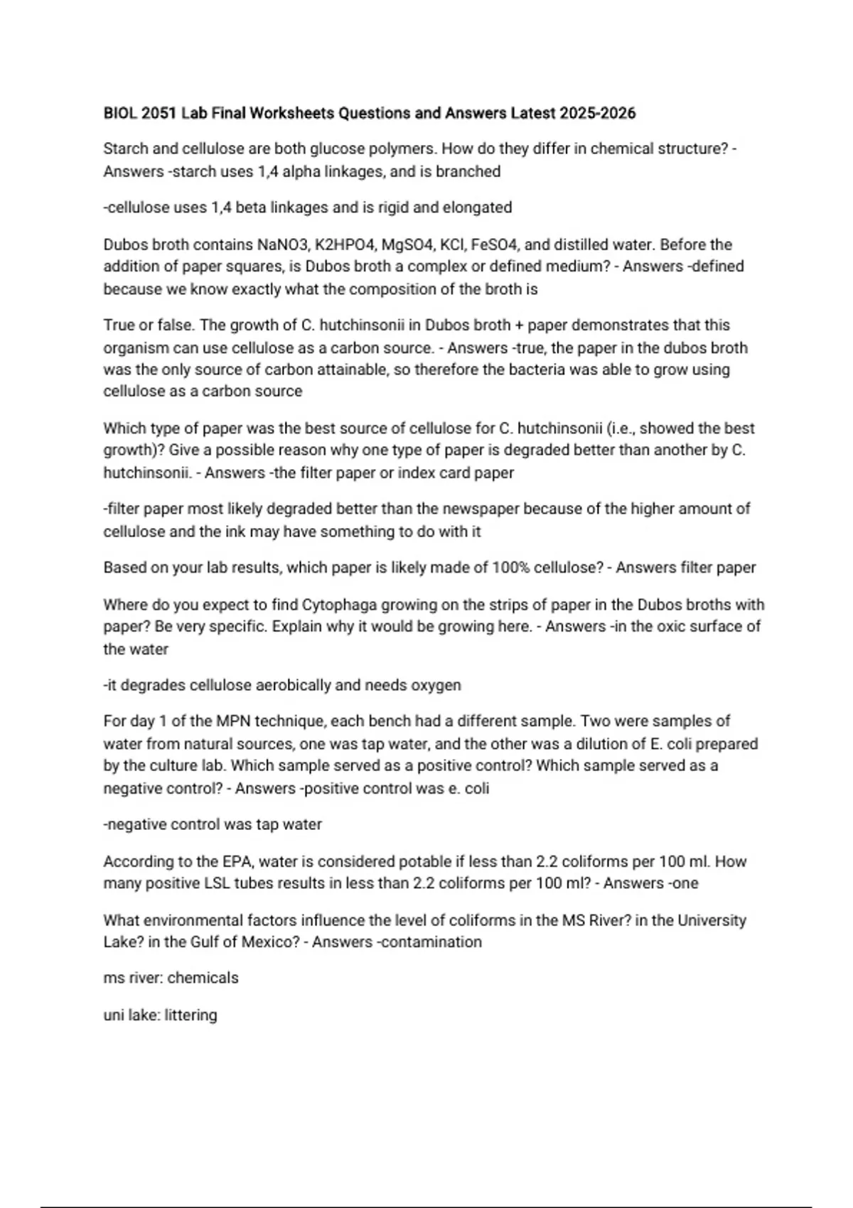 BIOL 2051 Lab Final Worksheets Questions and Answers Latest Starch and cellulose are both glucose polymers. How do they differ in chemical structure? - Answers -starch uses 1,4 alpha linkages, and is branched -cellulose uses 1,4 beta linkages and is rigid and elongated Dubos broth contains NaNO3, K2HPO4, MgSO4, KCl, FeSO4, and distilled water. Before the addition of paper squares, is Dubos broth a complex or defined medium? - Answers -defined because we know exactly what the composition of the broth is True or false. The growth of C. hutchinsonii in Dubos broth + paper demonstrates that this organism can use cellulose as a carbon source. - Answers -true, the paper in the dubos broth was the only source of carbon attainable, so therefore the bacteria was able to grow using cellulose as a carbon source Which type of paper was the best source of cellulose for C. hutchinsonii (i.e., showed the best growth)? Give a possible reason why one type of paper is degraded better than another by C. hutchinsonii. - Answers -the filter paper or index card paper -filter paper most likely degraded better than the newspaper because of the higher amount of cellulose and the ink may have something to do with it Based on your lab results, which paper is likely made of 100% cellulose? - Answers filter paper Where do you expect to find Cytophaga growing on the strips of paper in the Dubos broths with paper? Be very specific. Explain why it would be growing here. - Answers -in the oxic surface of the water -it degrades cellulose aerobically and needs oxygen For day 1 of the MPN technique, each bench had a different sample. Two were samples of water from natural sources, one was tap water, and the other was a dilution of E. coli prepared by the culture lab. Which sample served as a positive control? Which sample served as a negative control? - Answers -positive control was e. coli -negative control was tap water According to the EPA, water is considered potable if less than 2.2 coliforms per 100 ml. How many positive LSL tubes results in less than 2.2 coliforms per 100 ml? - Answers -one What environmental factors influence the level of coliforms in the MS River? in the University Lake? in the Gulf of Mexico? - Answers -contamination ms river: chemicals uni lake: littering gulf: chemicals, oil spills, river run off How is gas collection in the Durham tube an indication of the presence of coliforms? - Answers -coliforms ferment lactose which produces CO2 in the durham tubes What reaction is carried out by an indole-positive organism? - Answers Escherichia coli and Enterobacter aerogenes colonies look different on EMB. Describe this difference by explaining the connection between lactose fermentation and dye uptake. If you lacked an EMB plate, how could you distinguish between E. coli and E. aerogenes? - Answers -on emb plate e coli has a metallic green appearance because it is a lactose fermenter and produces a lot of acids and e aerogenes has a fish eye appearance which only the center of the colonies takes up dyes because it produces much less acid -if lacking an emb plate, one can distinguish between them by measuring acid production Methyl red is a pH indicator, turning red under ___________ conditions. What products reduce the pH of the growth medium and give a positive methyl red test? - Answers -positive -production of acids reduce the pH of the growth medium The Voges-Proskauer test uses alpha naphthol and 40% potassium hydroxide to detect the presence of _________________ made from the fermentation of glucose in organisms like ____________________. - Answers -acetoin (acetyl methyl carbinol) -E. aerogenes Simmons' citrate agar contains a pH indicator ________________________. Under what conditions does the color of this pH indicator change? - Answers -bromothymol blue -when alkaline products are formed and a rise in the pH takes place, it goes from green to blue To grow on Simmons' citrate agar, an organism must be able to use sodium citrate as a _____________ source and ammonia salts as a ________________ source. - Answers -carbon