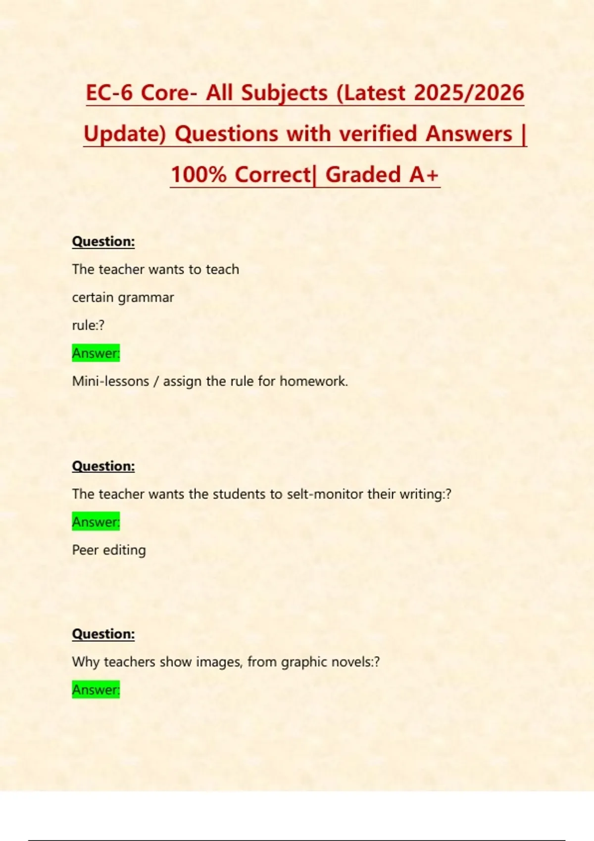 EC-6 Core- All Subjects (Latest 2025/2026 Update) Questions with verified Answers | 100% Correct| Graded A+