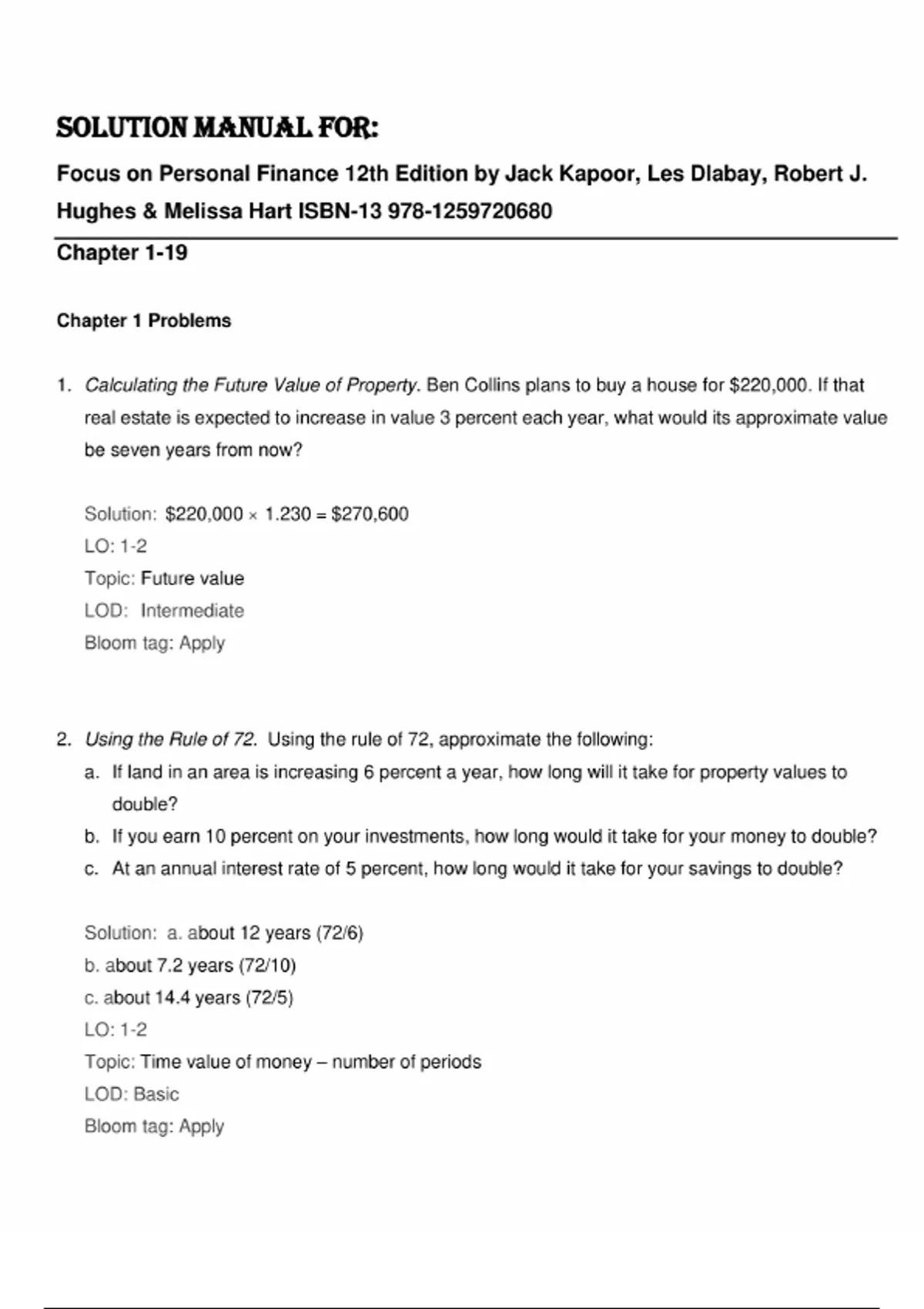 This document provides the complete solution manual for Focus on Personal Finance, 12th Edition by Jack Kapoor, Les Dlabay, Robert J. Hughes, and Melissa Hart. It includes step-by-step solutions to all end-of-chapter problems and financial planning exercises across all 19 chapters. Topics include budgeting, saving, credit use, housing and auto decisions, insurance planning, retirement and estate planning, taxes, and investing. The solutions are tailored for accuracy and support student learning, making this manual a key tool for personal finance exam preparation and course success.