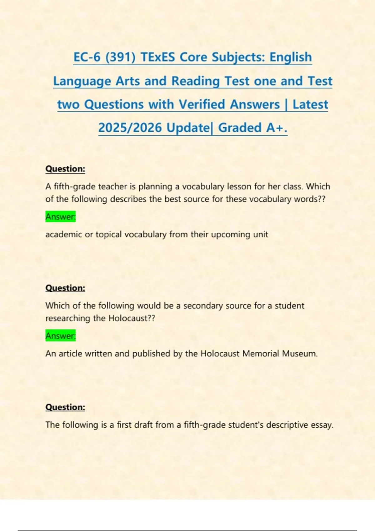 EC-6 (391) TExES Core Subjects: English Language Arts and Reading Test one and Test two Questions with Verified Answers | Latest 2025/2026 Update| Graded A+. EC-6 (391) TExES Core Subjects: English Language Arts and Reading Test one and Test two Questions with Verified Answers | Latest 2025/2026 Update| Graded A+.