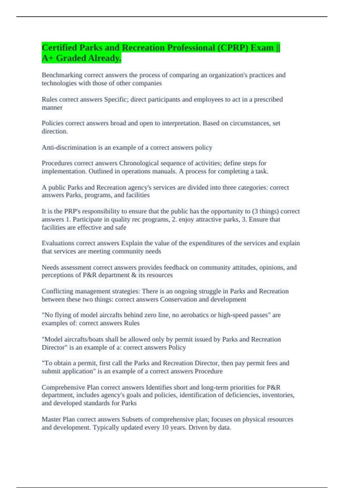 Certified Parks and Recreation Professional (CPRP) Exam || A+ Graded Already.