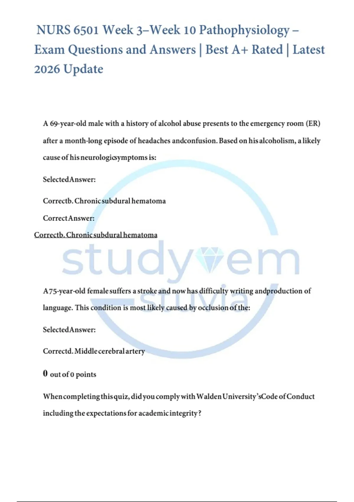 This document provides the fully updated 2026 collection of NURS 6501 Advanced Pathophysiology exam questions and answers covering Weeks 3 through 10. It includes accurate, detailed explanations related to system-specific pathophysiology, including cardiovascular, respiratory, renal, endocrine, neurological, and immune disorders. The content is structured to support deep understanding of disease mechanisms and high-level course performance, offering comprehensive review material aligned with weekly learning objectives.
