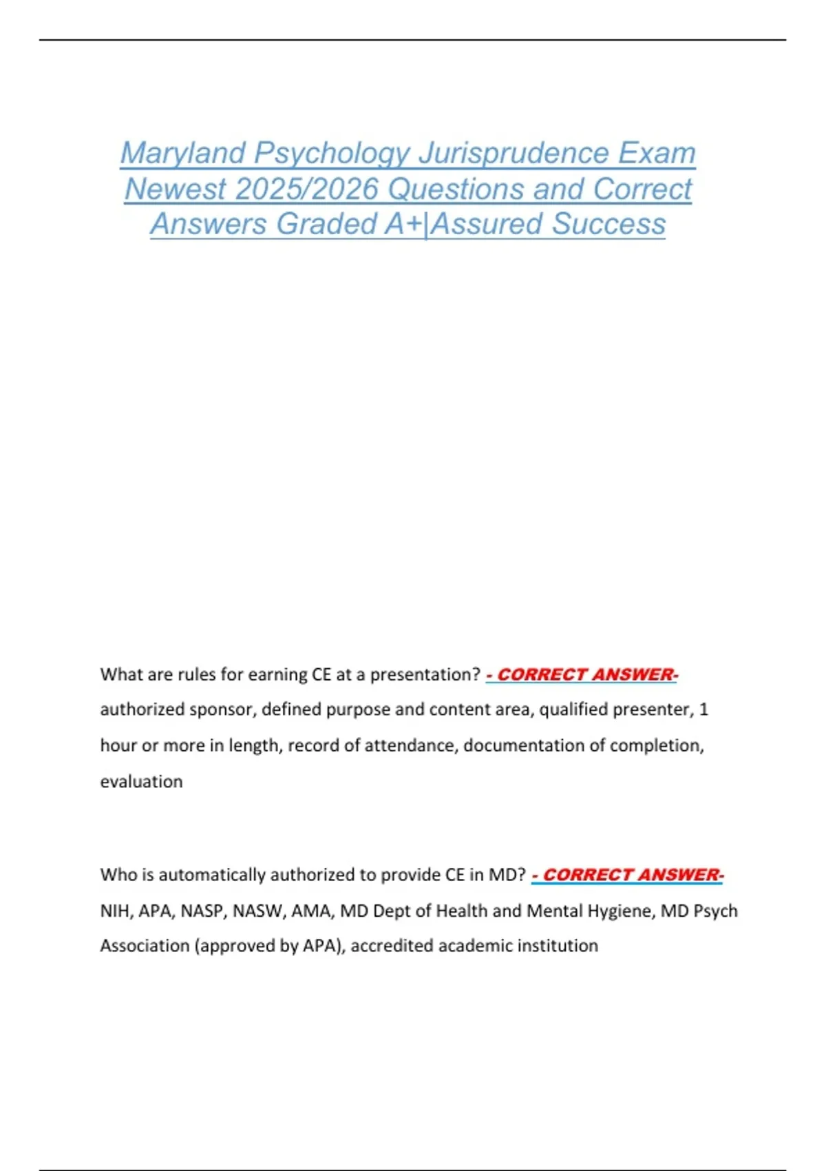 Maryland Psychology Jurisprudence Exam Newest 2025/2026 Questions and Correct Answers Graded A+|Assured Success