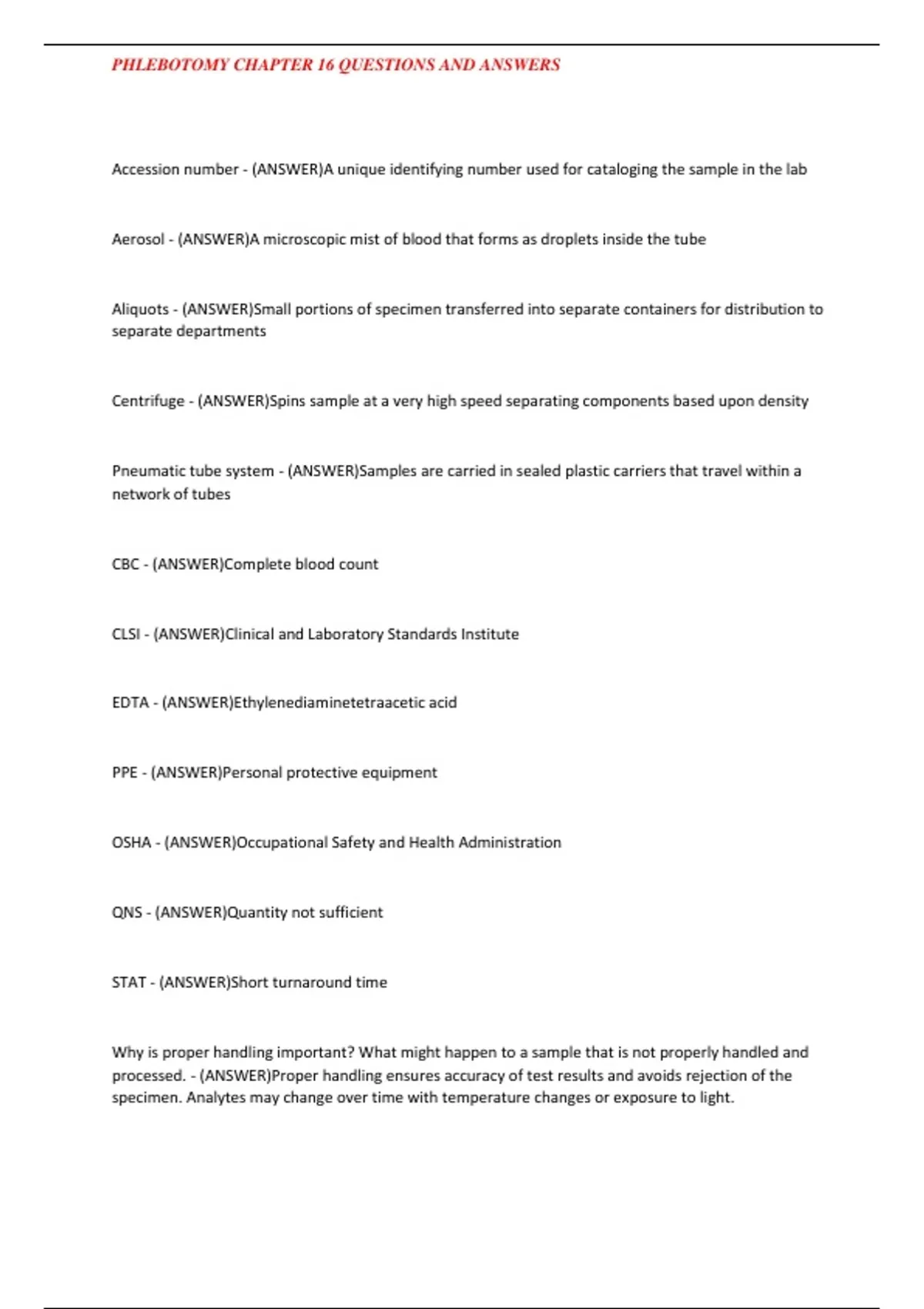 , PHLEBOTOMY CHAPTER 16 QUESTIONS AND ANSWERS