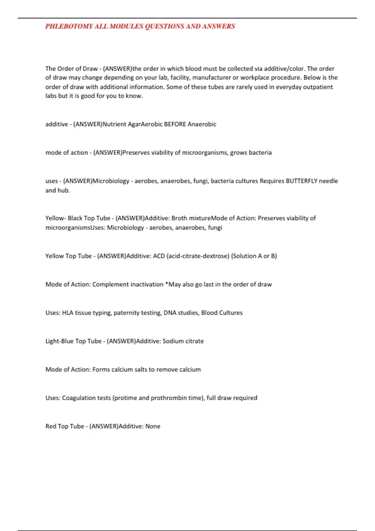,PHLEBOTOMY ALL MODULES QUESTIONS AND ANSWERS