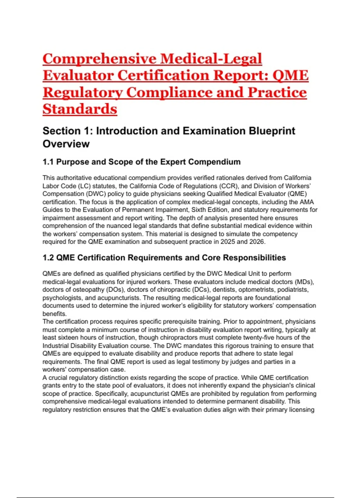 This document contains a complete, structured mock examination designed for physicians preparing for the California Qualified Medical Evaluator (QME) certification. It covers all major competency domains required by the DWC: regulatory compliance, report-writing standards, AMA Guides Sixth Edition impairment methodology, apportionment, medical-legal timelines, panel procedures for represented and unrepresented workers, and the legal standards of substantial medical evidence. The material includes detailed explanations, rule citations, and fully developed rationales to mirror the depth of analysis expected for 2025–2026 QME examinations. This resource is suitable for exam preparation, regulatory review, and medical-legal practice refinement.