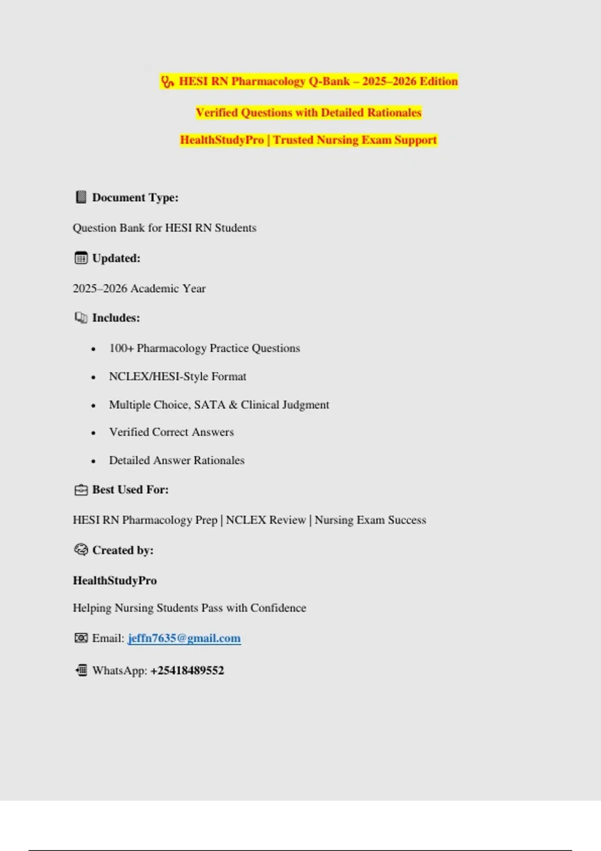 Prepare confidently for your HESI RN Pharmacology exam with this 2025–2026 updated Q-Bank Test Bank, packed with verified, exam-style questions and clear, detailed rationales. Designed to match real HESI difficulty and structure, this resource strengthens your medication knowledge, dosage understanding, side-effect recognition, and safe-pharmacology decision-making. Every question includes a step-by-step rationale, making complex drug concepts easy to understand and helping you build strong clinical reasoning skills. Perfect for HESI prep, nursing school exams, NCLEX reinforcement, and last-minute revision. A trusted resource from HealthStudyPro, created to help nursing students master pharmacology with confidence and accuracy.