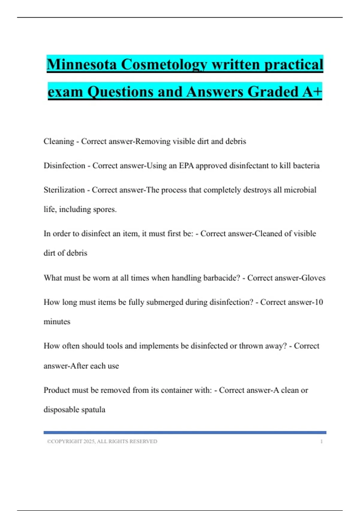 Minnesota Cosmetology written practical exam Questions and Answers Graded A+