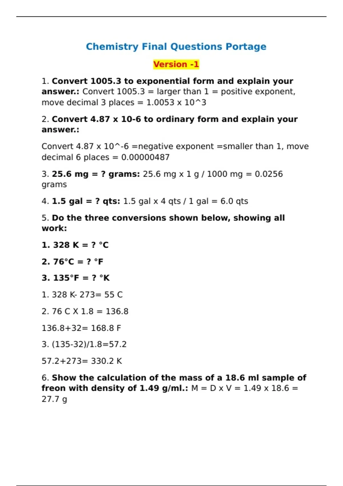Chemistry Final Questions Portage