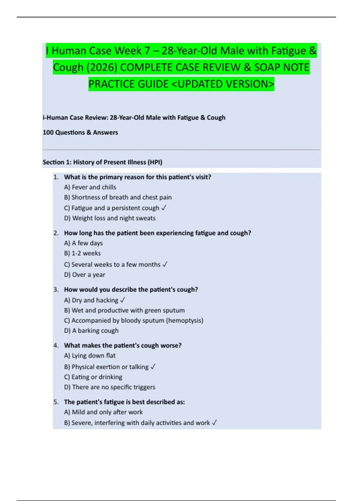 I Human Case Week 7 – 28-Year-Old Male with Fatigue & Cough (2026) COMPLETE CASE REVIEW & SOAP NOTE PRACTICE GUIDE &lt;UPDATED VERSION&gt; i-Human Case Review: 28-Year-Old Male with Fatigue & Cough 100 Questions & Answers Section 1: History of Present Illness (HPI) 1. What is the primary reason for this patient's visit? A) Fever and chills B) Shortness of breath and chest pain C) Fatigue and a persistent cough D) Weight loss and night sweats 2. How long has the patient been experiencing fatigue and cough? A) A few days B) 1-2 weeks C) Several weeks to a few months D) Over a year 3. How would you describe the patient's cough? A) Dry and hacking B) Wet and productive with green s