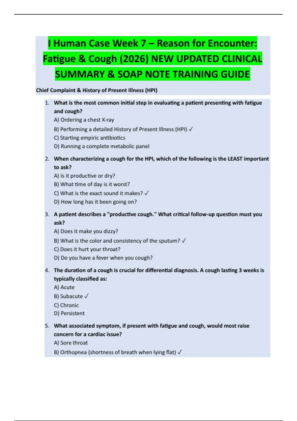 I Human Case Week 7 – Reason for Encounter: Fatigue & Cough (2026) NEW UPDATED CLINICAL SUMMARY & SOAP NOTE TRAINING GUIDE Chief Complaint & History of Present Illness (HPI) 1. What is the most common initial step in evaluating a patient presenting with fatigue and cough? A) Ordering a chest X-ray B) Performing a detailed History of Present Illness (HPI) C) Starting empiric antibiotics D) Running a complete metabolic panel 2. When characterizing a cough for the HPI, which of the following is the LEAST important to ask? A) Is it productive or dry? B) What time of day is it worst? C) What is the exact sound it makes? D) How long has it been going on? 3. A patient describes a "productive cough." What critical follow-up question must you ask? A) Does it make you dizzy? B) What is the color and consistency of the sputum? C) Does it hurt your throat? D) Do you have a fever when you cough? 4. The duration of a cough is crucial for differential diagnosis. A cough lasting 3 weeks is typically classified as: A) Acute B) Subacute C) Chronic D) Persistent 5. What associated symptom, if present with fatigue and cough, would most raise concern for a cardiac iss