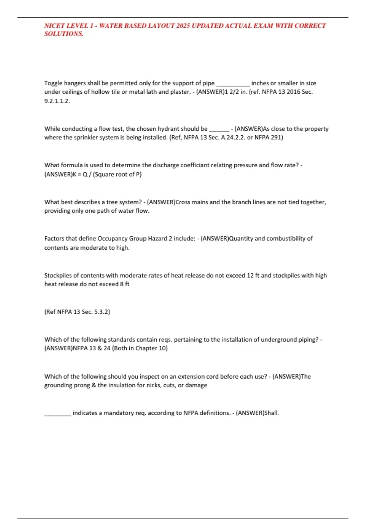 ,NICET LEVEL 1 - WATER BASED LAYOUT 2025 UPDATED ACTUAL EXAM WITH CORRECT