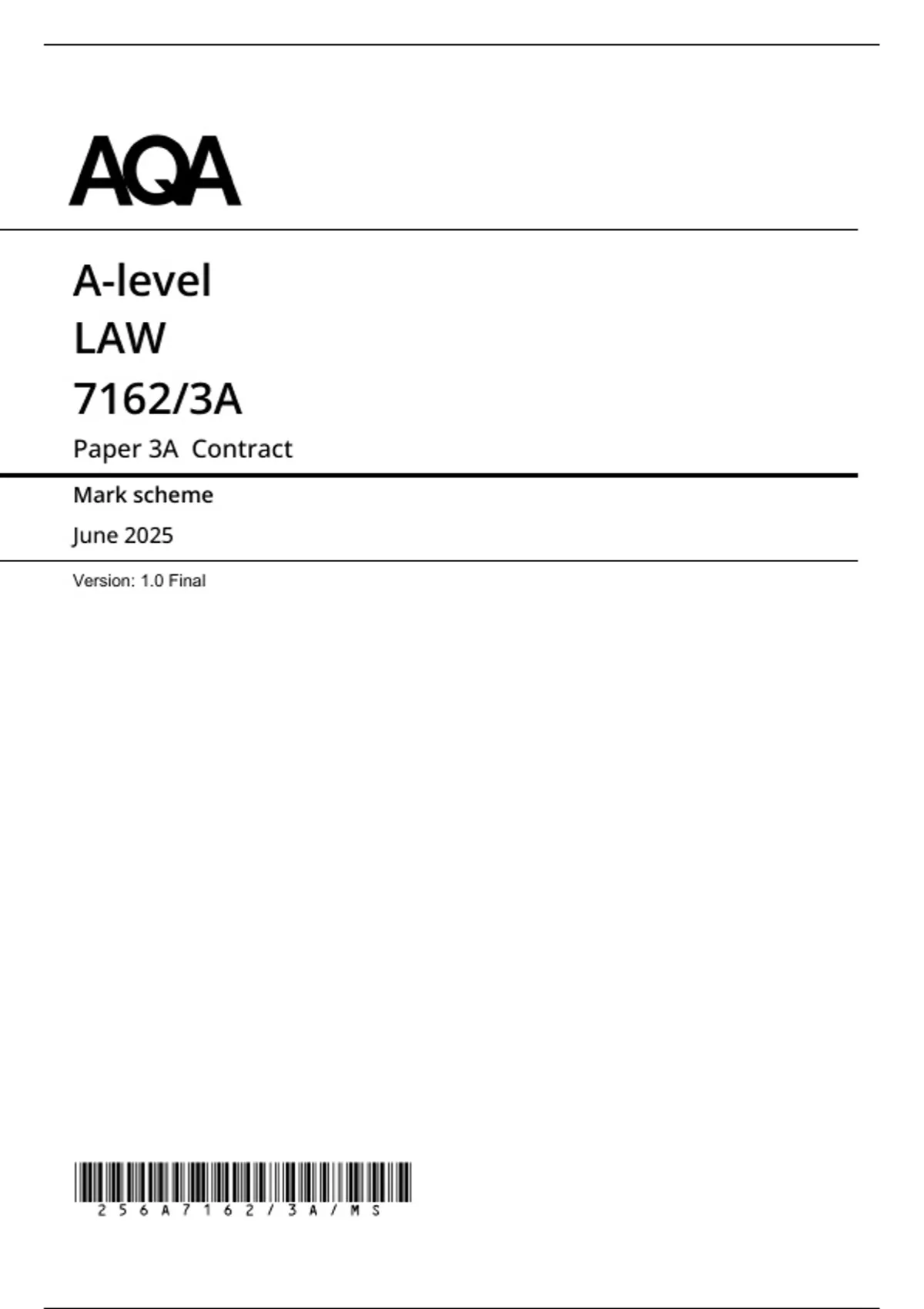 2025 AQA A level LAW Paper 3A MARK SCHEME :Contract (7162/3A