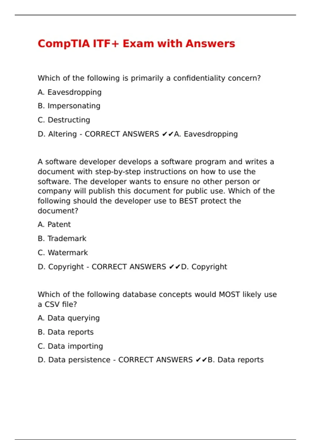 D. Altering - CORRECT ANSWERS ✔✔A. Eavesdropping