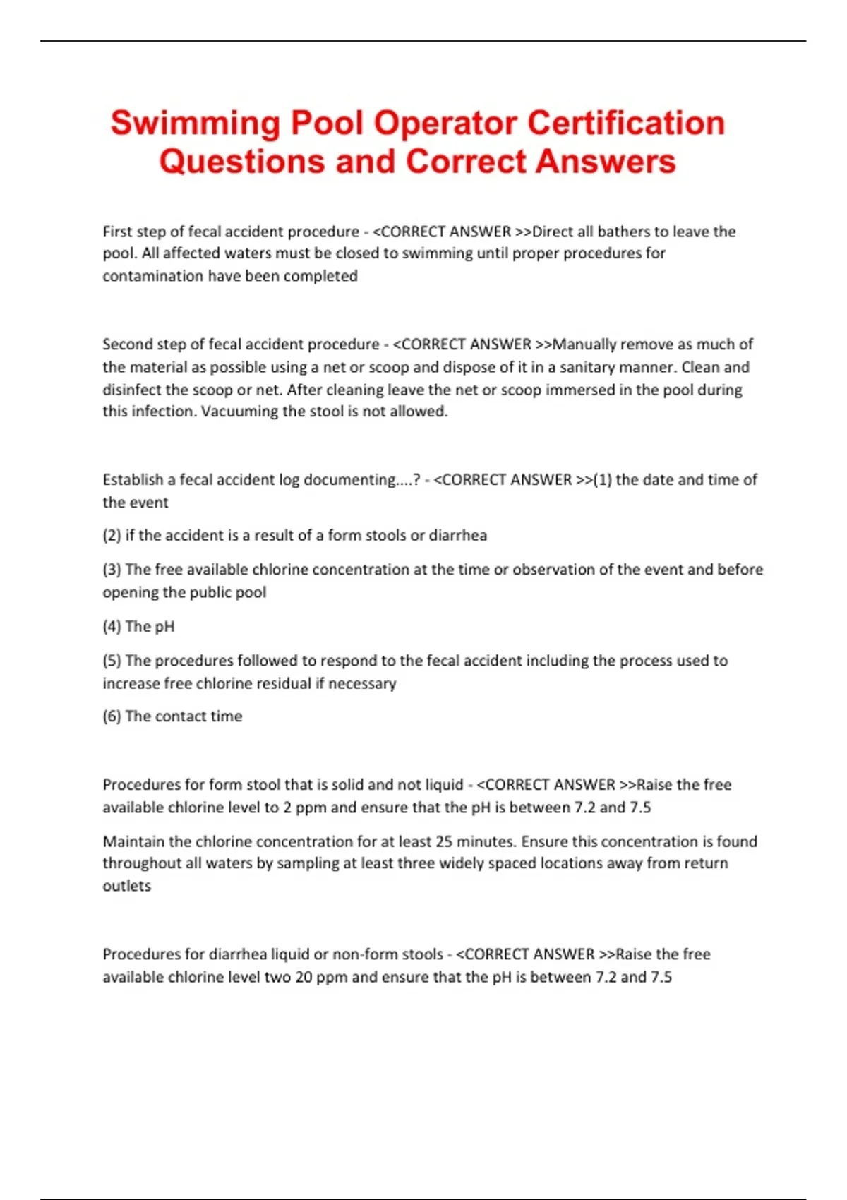 pool. All affected waters must be closed to swimming until proper procedures for