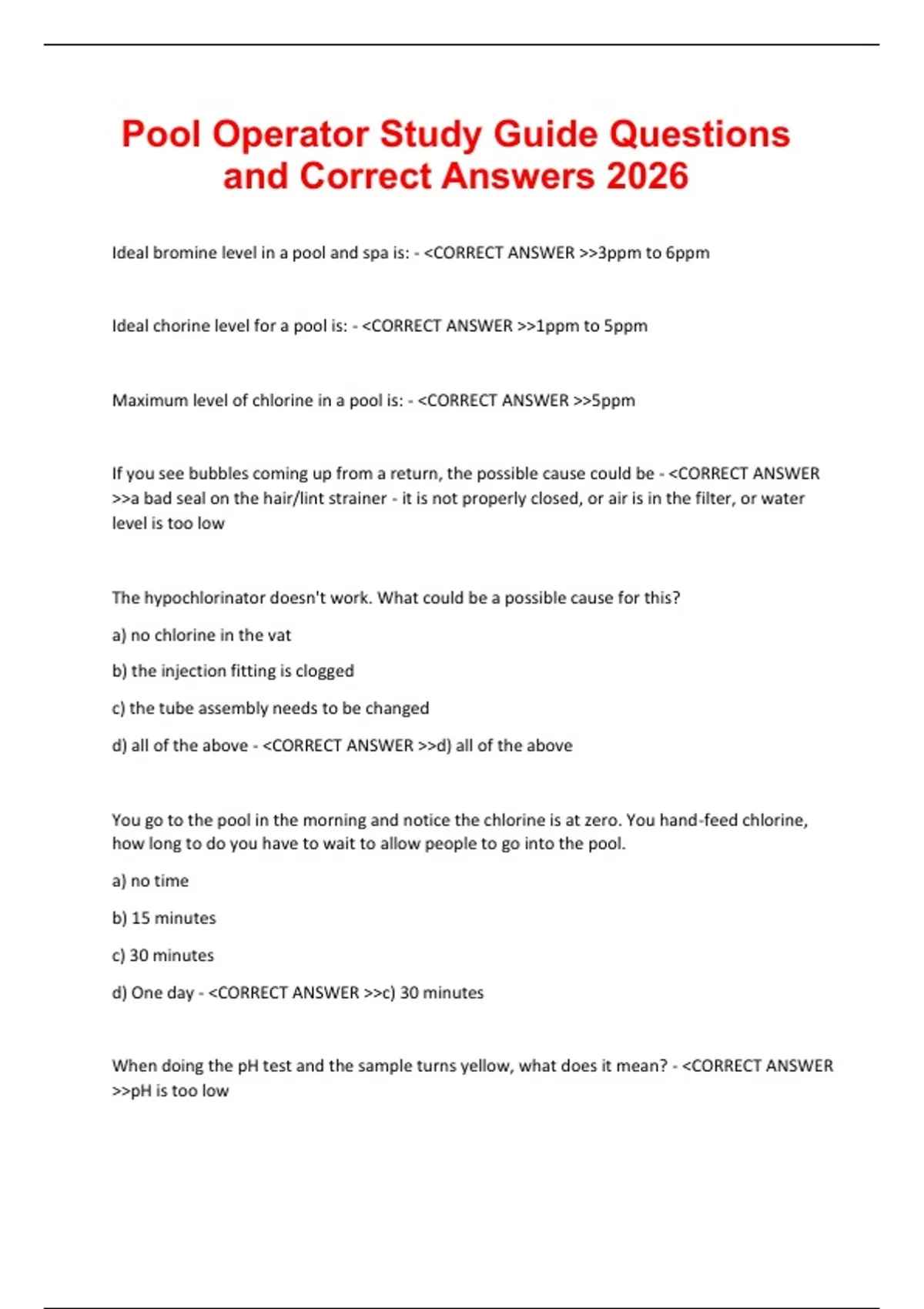 Maximum level of chlorine in a pool is: - <CORRECT ANSWER >>5ppm
