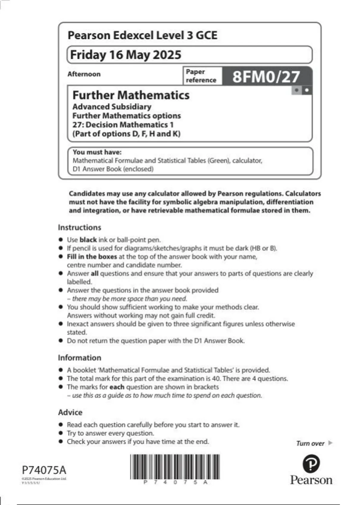 Pearson Edexcel Level 3 GCE Further Mathematics ( 8FM0) Advanced Subsidiary Further Mathematics options 27: Decision Mathematics 1 June 2025