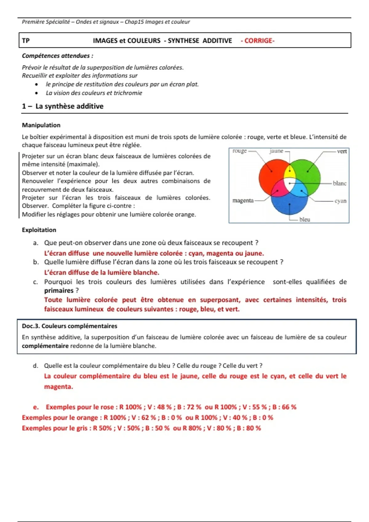 TP IMAGES et COULEURS - SYNTHESE ADDITIVE - CORRIGE-