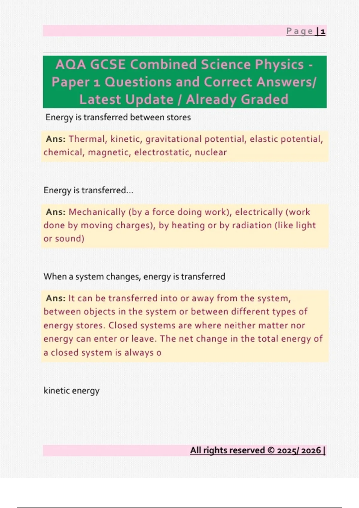AQA GCSE Combined Science Physics - Paper 1 Questions and Correct Answers/ Latest Update / Already Graded