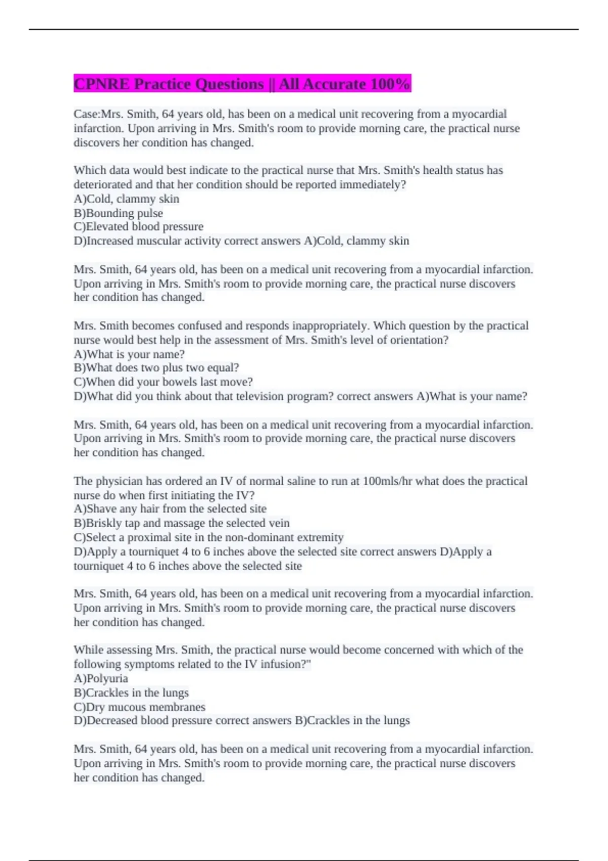 infarction. Upon arriving in Mrs. Smith's room to provide morning care, the practical nurse