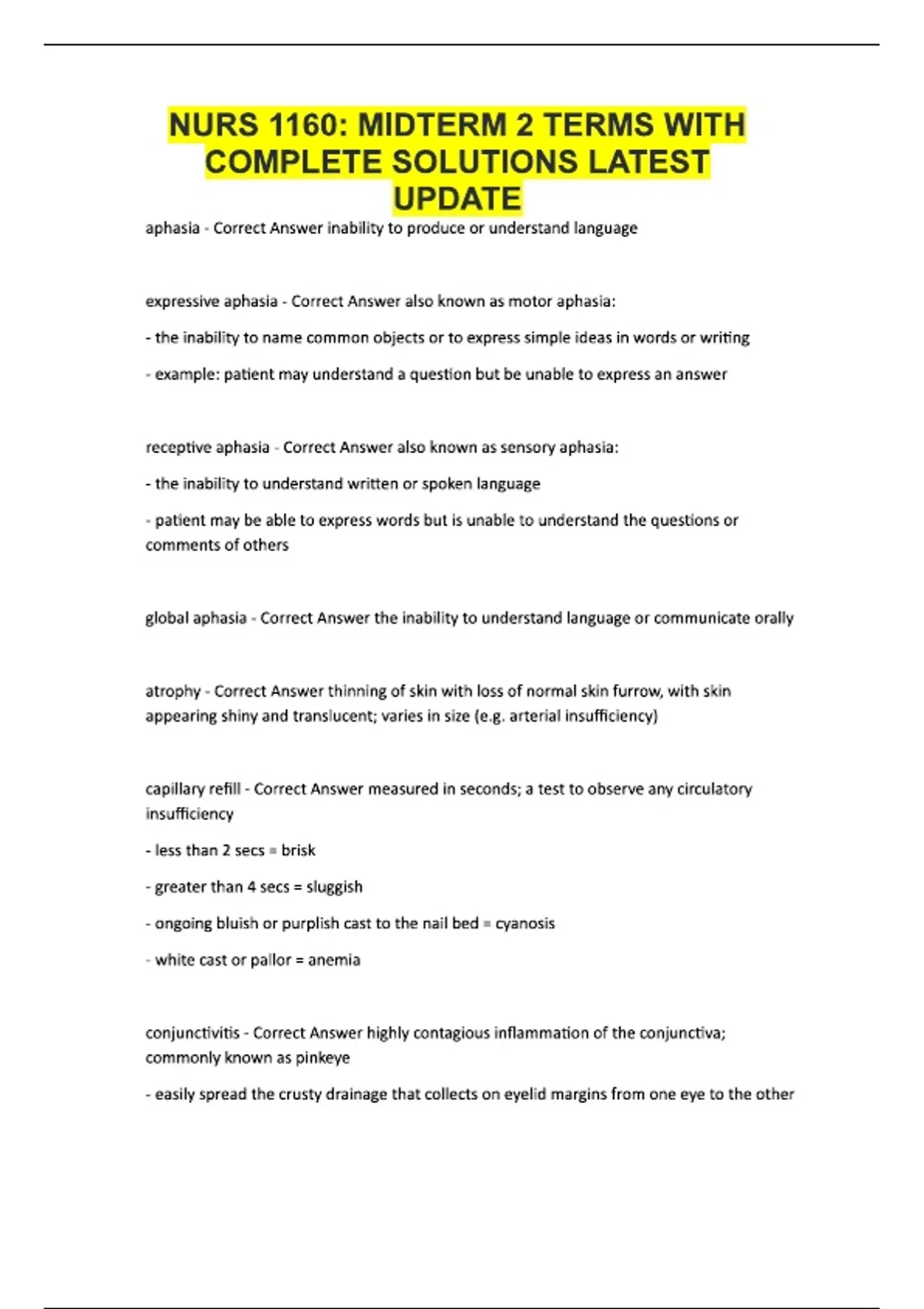 NURS 1160: MIDTERM 2 TERMS WITH COMPLETE SOLUTIONS LATEST UPDATE aphasia - Correct Answer inability to produce or understand language expressive aphasia - Correct Answer also known as motor aphasia: - the inability to name common objects or to express simple ideas in words or writing - example: patient may understand a question but be unable to express an answer receptive aphasia - Correct Answer also known as sensory aphasia: - the inability to understand written or spoken language - patient may be able to express words but is unable to understand the questions or comments of others global aphasia - Correct Answer the inability to understand language or communicate orally atrophy - Correct Answer thinning of skin with loss of normal skin furrow, with skin appearing shiny and translucent; varies in size (e.g. arterial insufficiency) capillary refill - Correct Answer measured in seconds; a test to observe any circulatory insufficiency - less than 2 secs = brisk - greater than 4 secs = sluggish