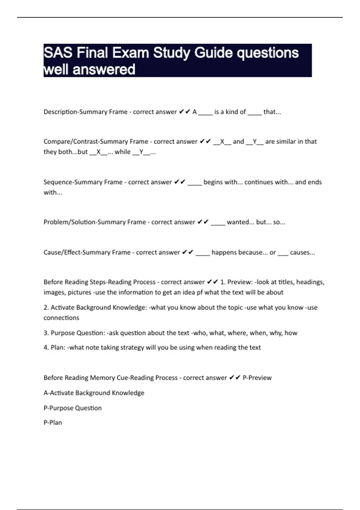 Before Reading Steps-Reading Process - correct answer ✔✔ 1. Preview: -look at titles, headings,
