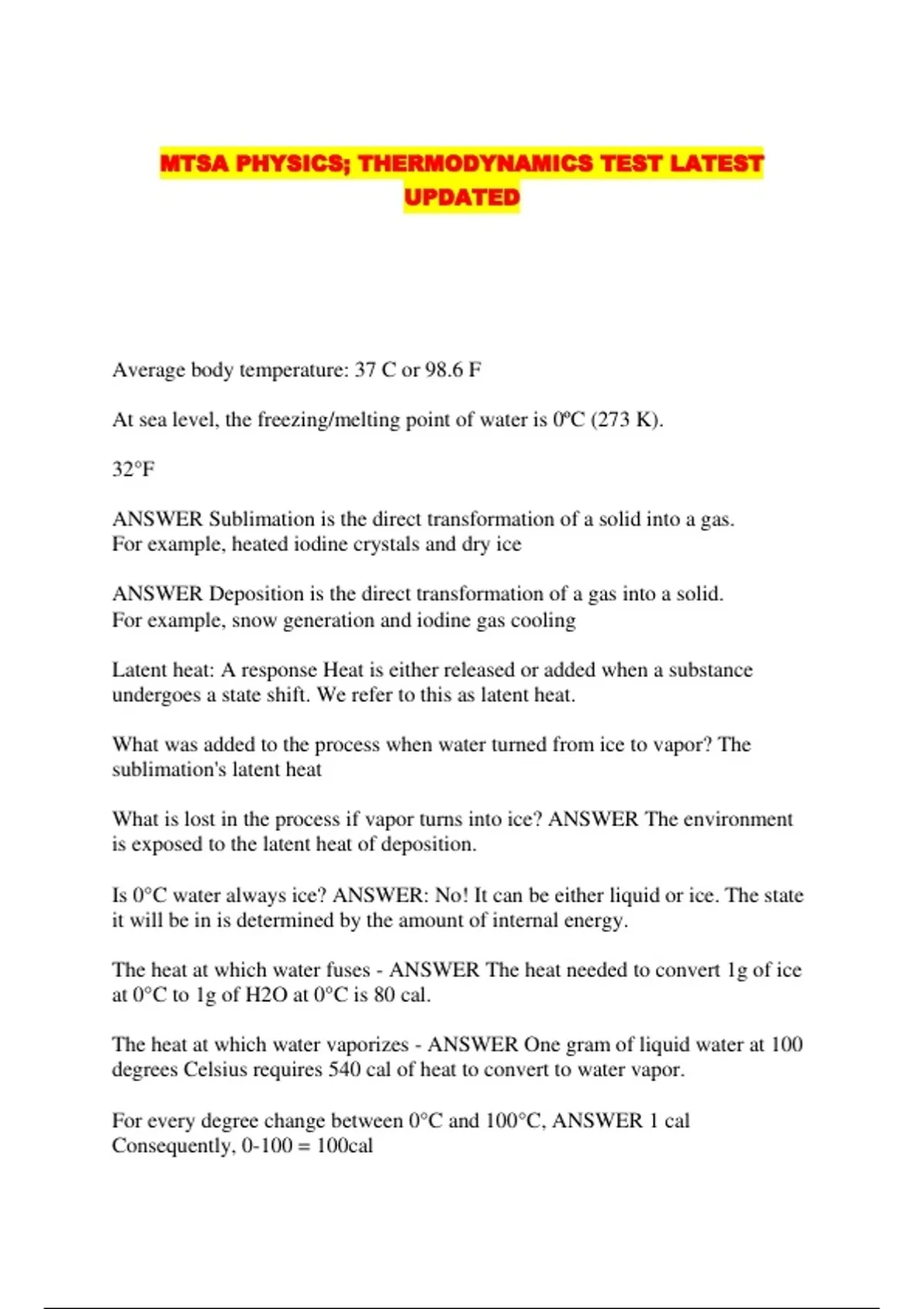 MTSA PHYSICS; THERMODYNAMICS TEST LATEST