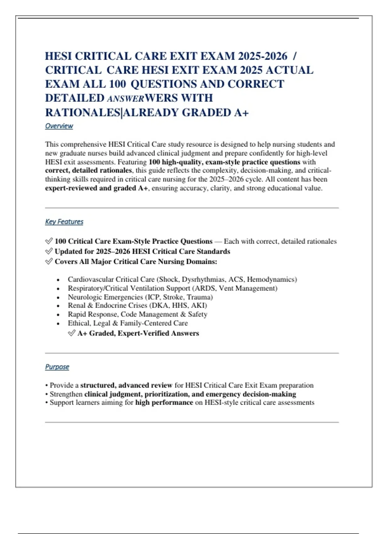 This comprehensive HESI Critical Care study resource is designed to help nursing students and