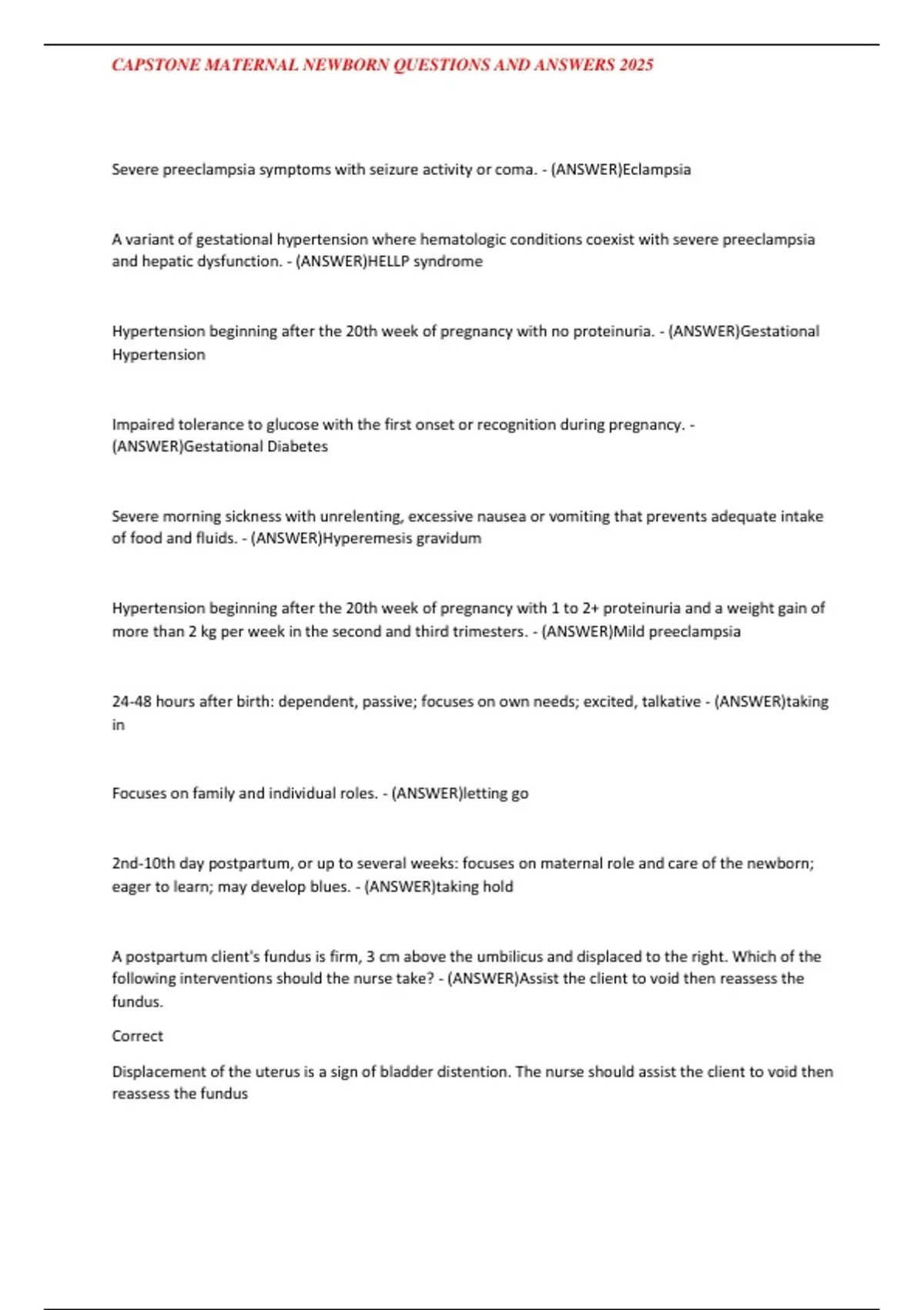 , CAPSTONE MATERNAL NEWBORN QUESTIONS AND ANSWERS 2025