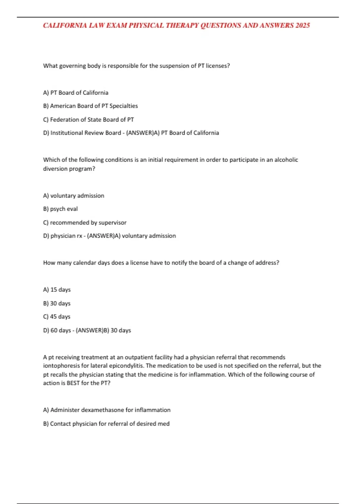, CALIFORNIA LAW EXAM PHYSICAL THERAPY QUESTIONS AND ANSWERS 2025