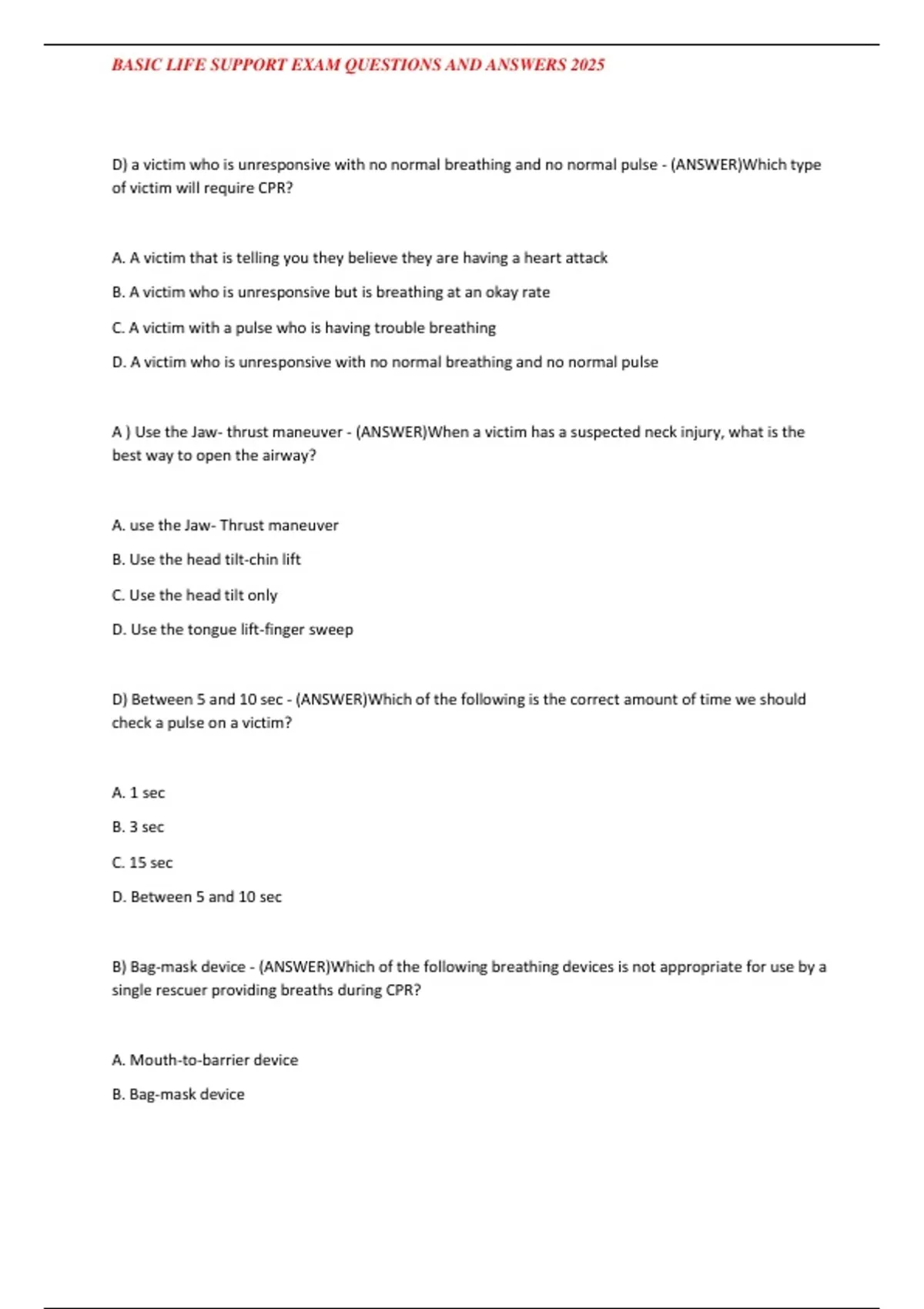 , BASIC LIFE SUPPORT EXAM QUESTIONS AND ANSWERS 2025