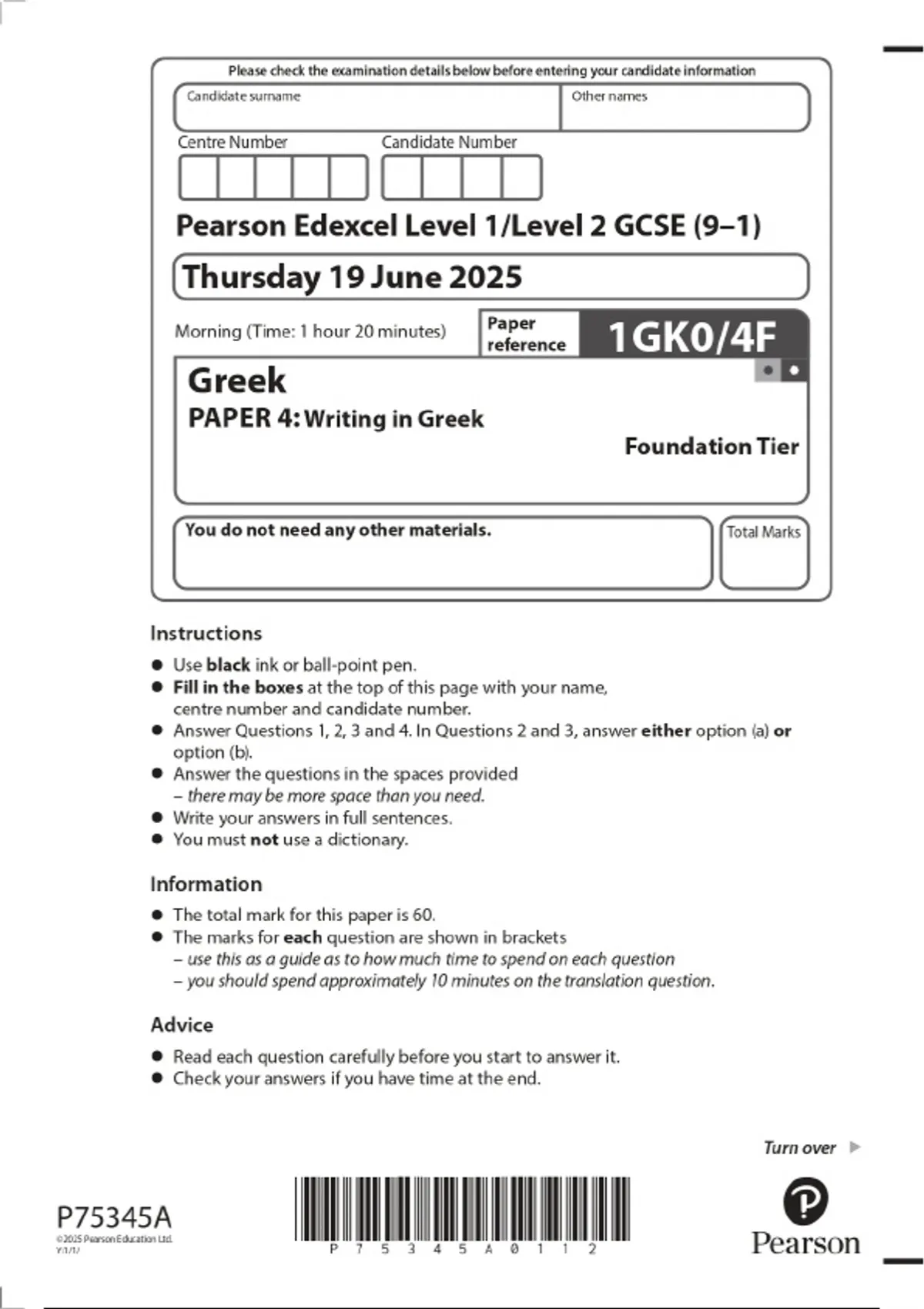 2025 Pearson Edexcel Level1/Level 2 GCSE (9–1) Greek PAPER 4: : Writing in Greek Foundation Tier Combined Question Paper and Marking Scheme