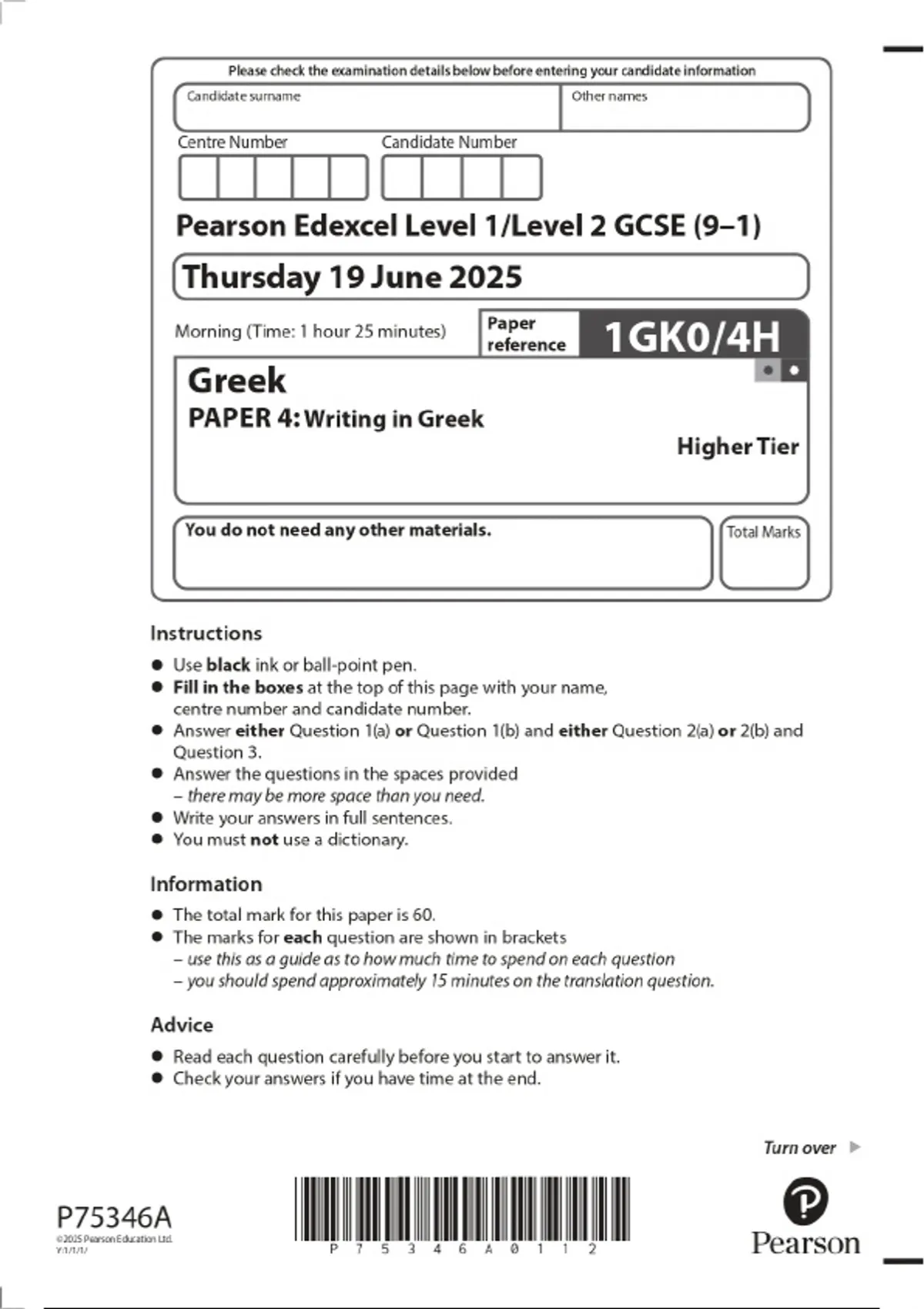 2025 Pearson Edexcel Level1/Level 2 GCSE (9–1) Greek PAPER 4: : Writing in Greek Higher Tier Combined Question Paper and Marking Scheme