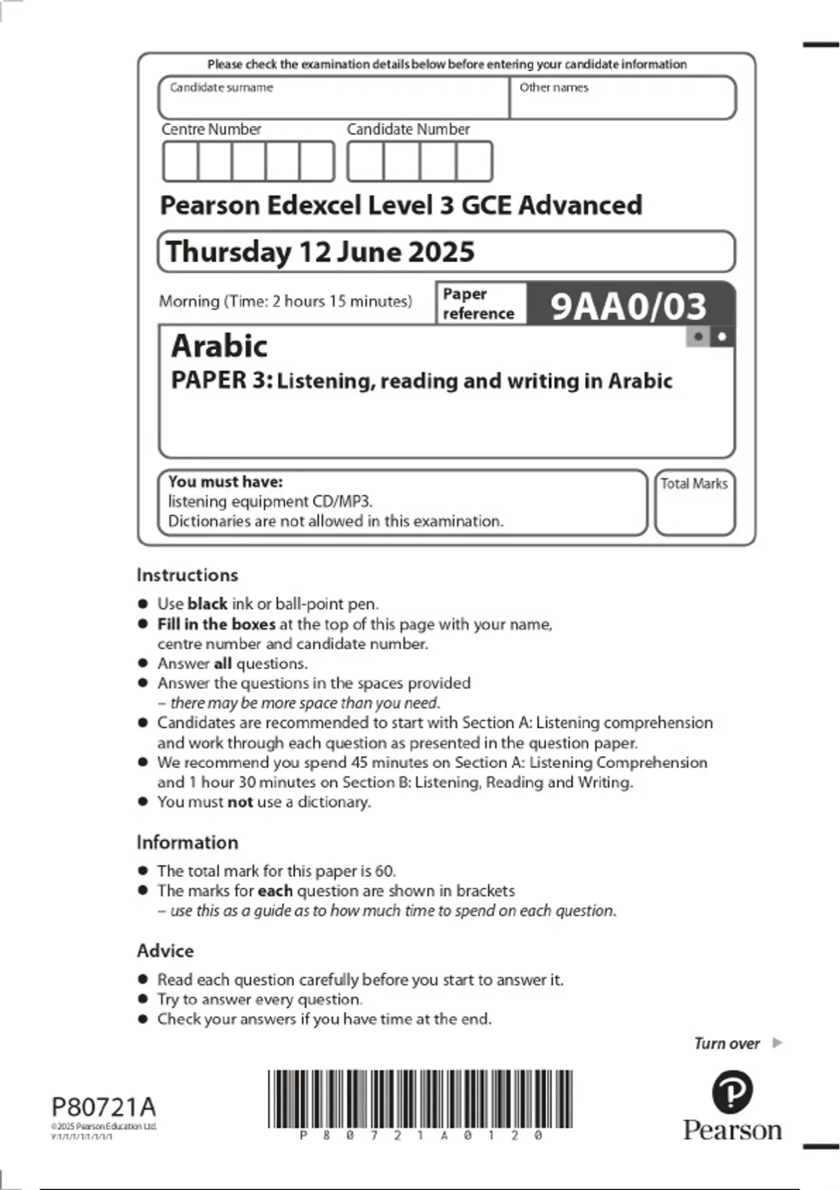2025 Pearson Edexcel Level 3 GCE Advanced Arabic PAPER 3: Listening, reading and writing in Arabic Combined Question Paper and Marking Scheme