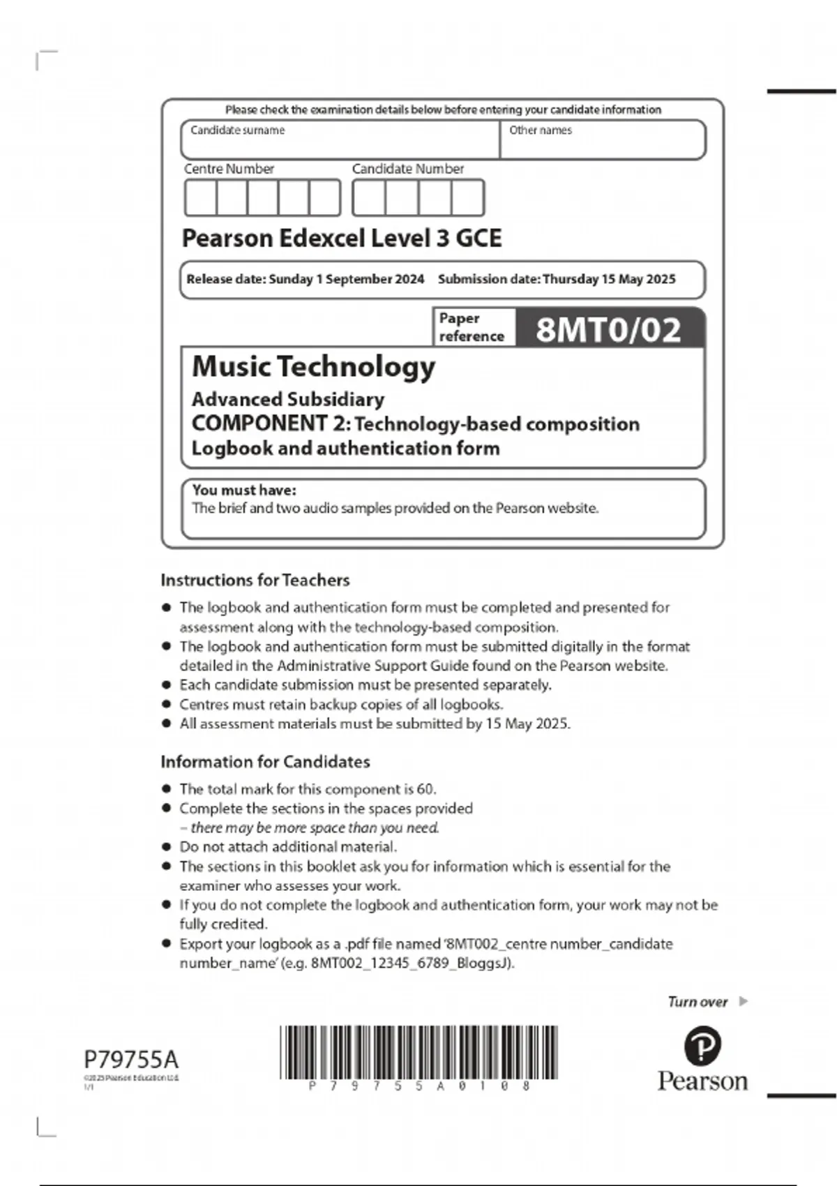 2025 Pearson Edexcel Level 3 GCE Music Technology Advanced Subsidiary COMPONENT 2: Technology-based composition Logbook and authentication form Combined Question Paper and Marking Scheme