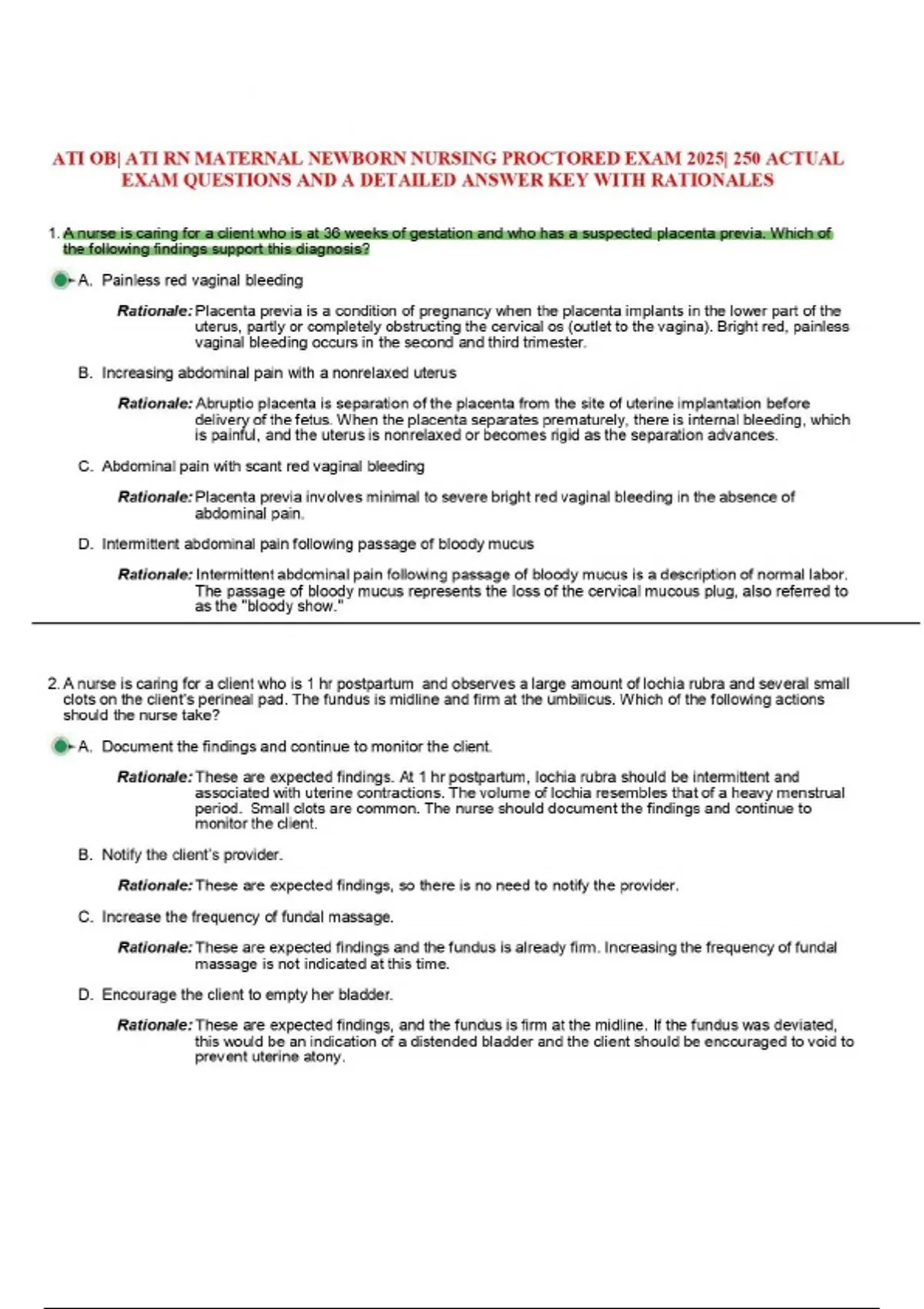 TI OB Detailed Answer Key is a comprehensive, exam-focused study resource designed for nursing students preparing for ATI Obstetrics (OB) assessments. This document provides clear, step-by-step explanations, rationales, and correct answers for key OB nursing topics, helping learners strengthen clinical judgment and improve test performance. It covers essential areas such as maternal health, prenatal care, intrapartum and postpartum nursing, fetal assessment, high-risk pregnancy conditions, newborn care, and OB pharmacology. Ideal for revision, self-paced learning, and exam confidence building, this answer key supports mastery of OB concepts aligned with ATI competencies.